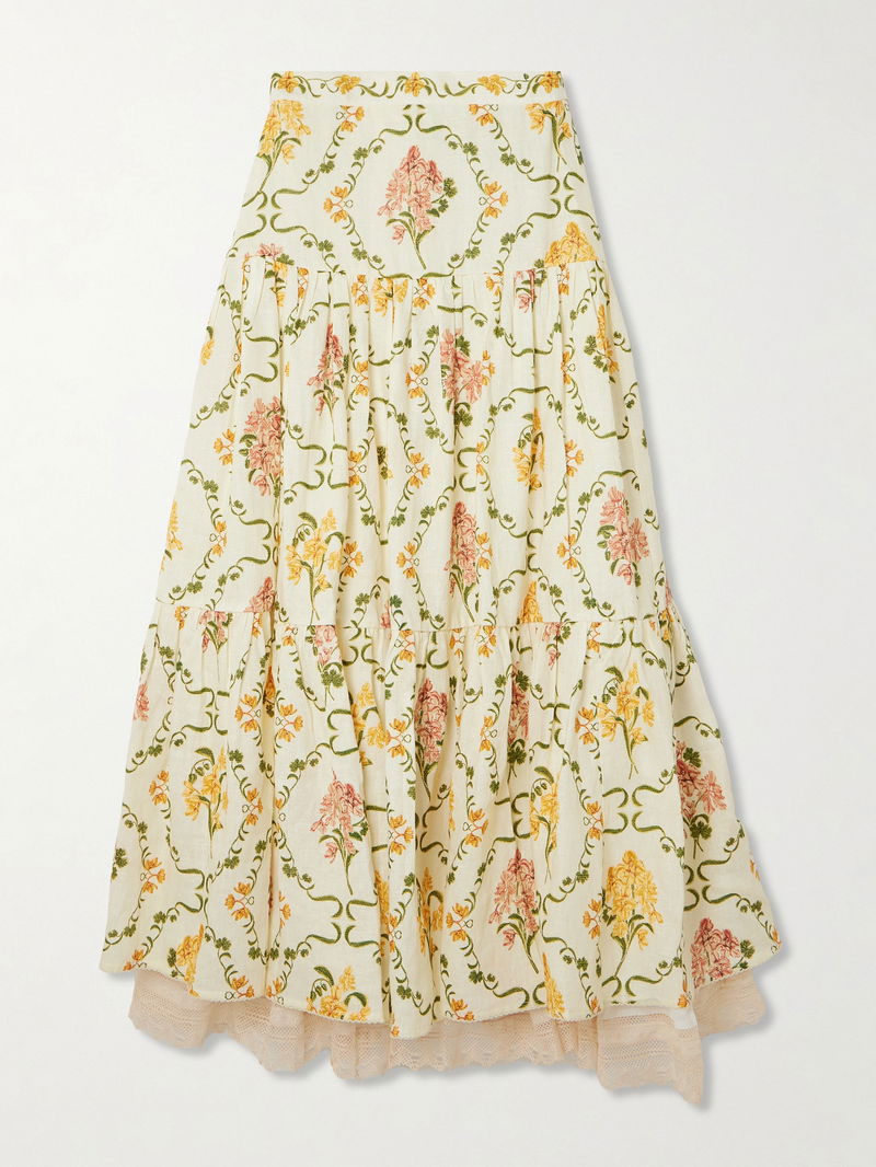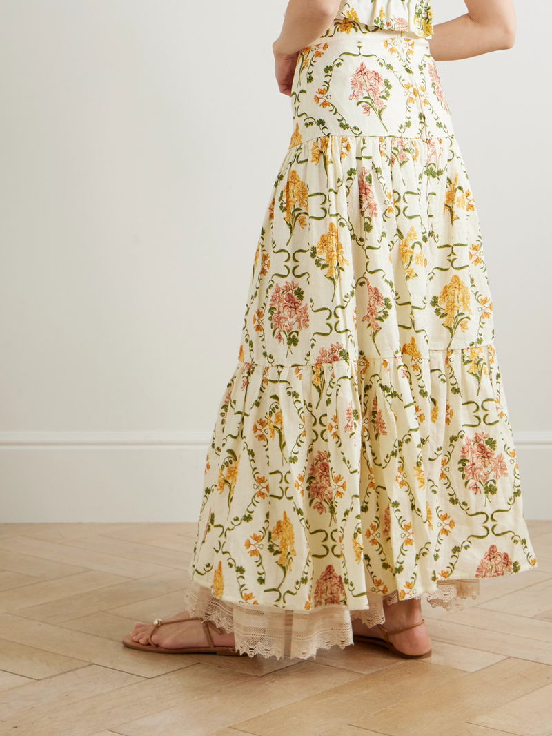 Agua by Agua Bendita's 'Anis Cordillera' skirt captures the label's vivacious Colombian spirit. Crafted from lightweight linen, it's detailed with pleats and tiers and is printed with pretty floral motifs. Delicate lace adorns the hem.