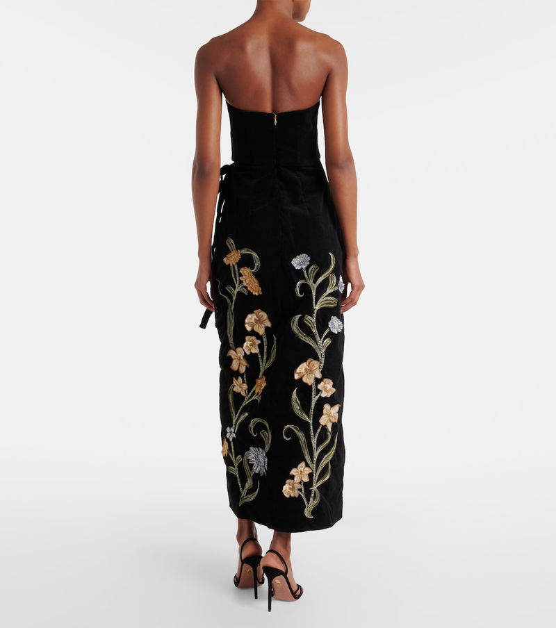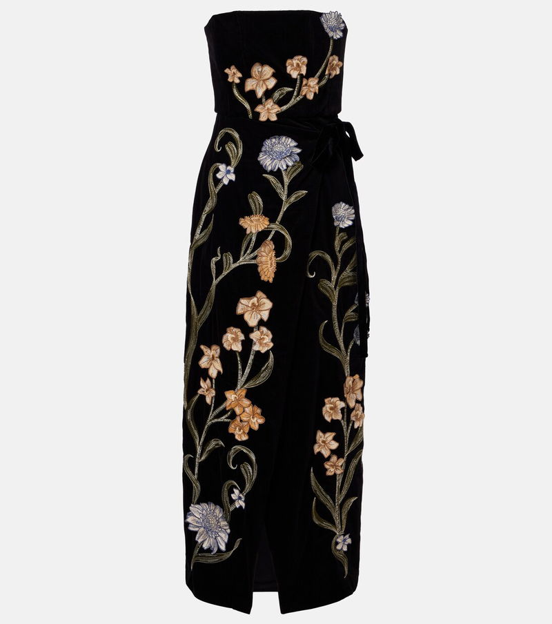 Agua by Agua Bendita’s designs are carefully handcrafted by local female artisans in and around Medellín, Colombia. The Cinefila Laguna maxi dress is made from cotton-blend velvet featuring floral embroidery and appliqués.