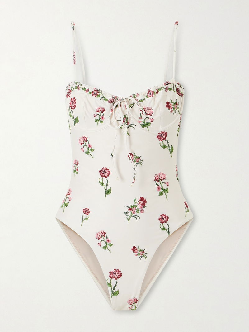Agua by Agua Bendita’s ‘Ébano’ swimsuit features a floral print of long-stem blooms that enhances its romantic charm. Made with recycled fibers and stretch, it has underwired sweetheart cups and a bow-accented neckline.