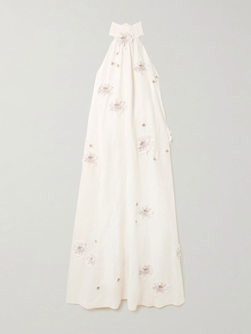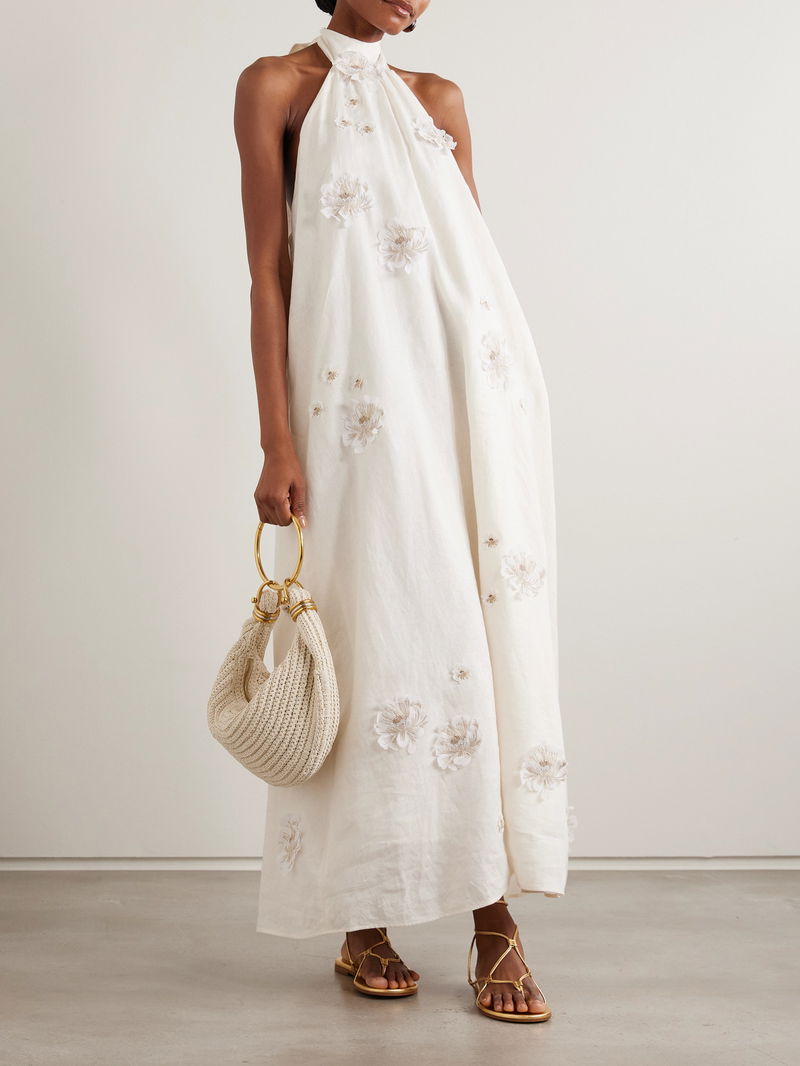 Agua by Agua Bendita's dress is brought to life by the embroidered and beaded floral appliqués. Made from breezy linen, it has an elegant halter neckline with long sash ties and falls to a floaty maxi hem. Wear yours on vacation with platform espadrilles.