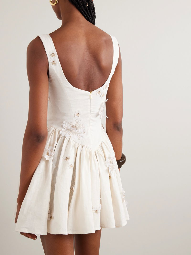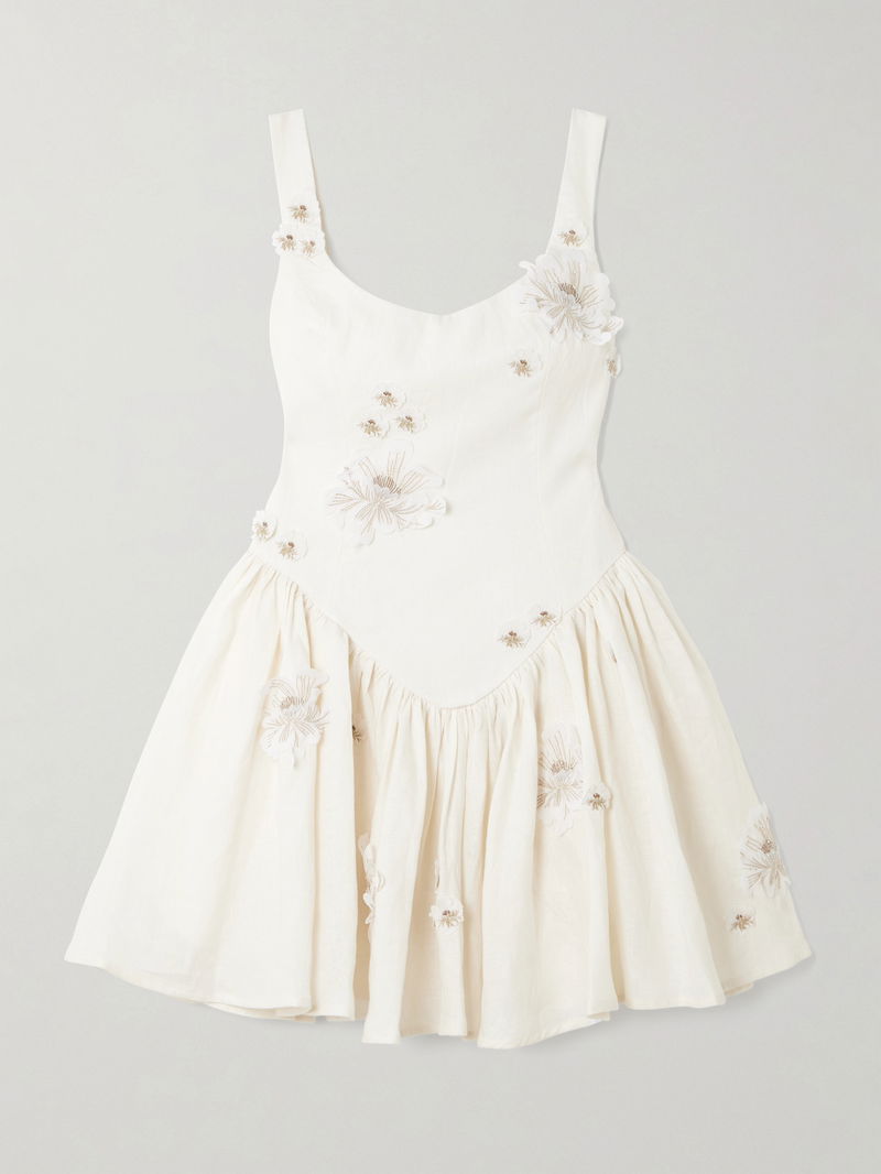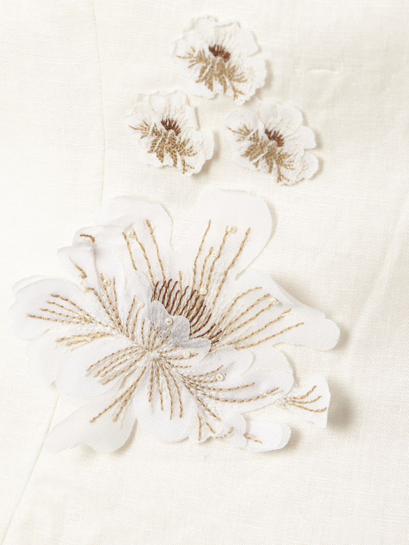 There are so many delicate details to admire on Agua by Agua Bendita's 'Lima' dress. It's made from linen with raw, handmade floral appliqués across the surface – notice how they're tipped with faux pearls.