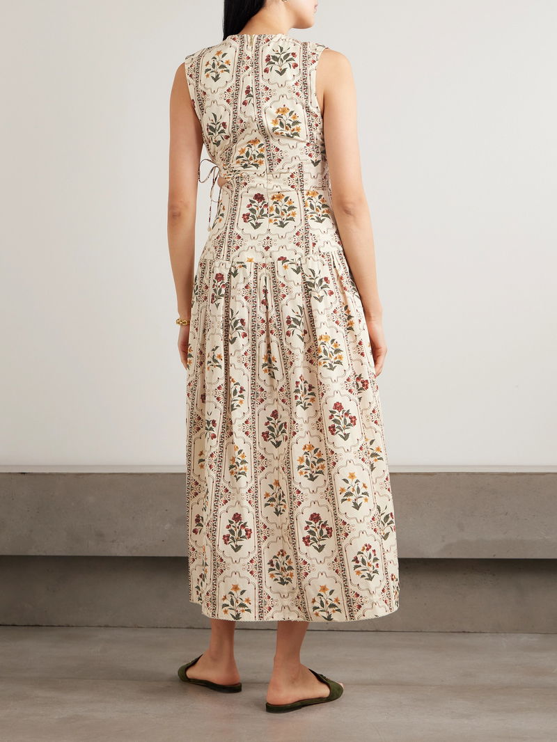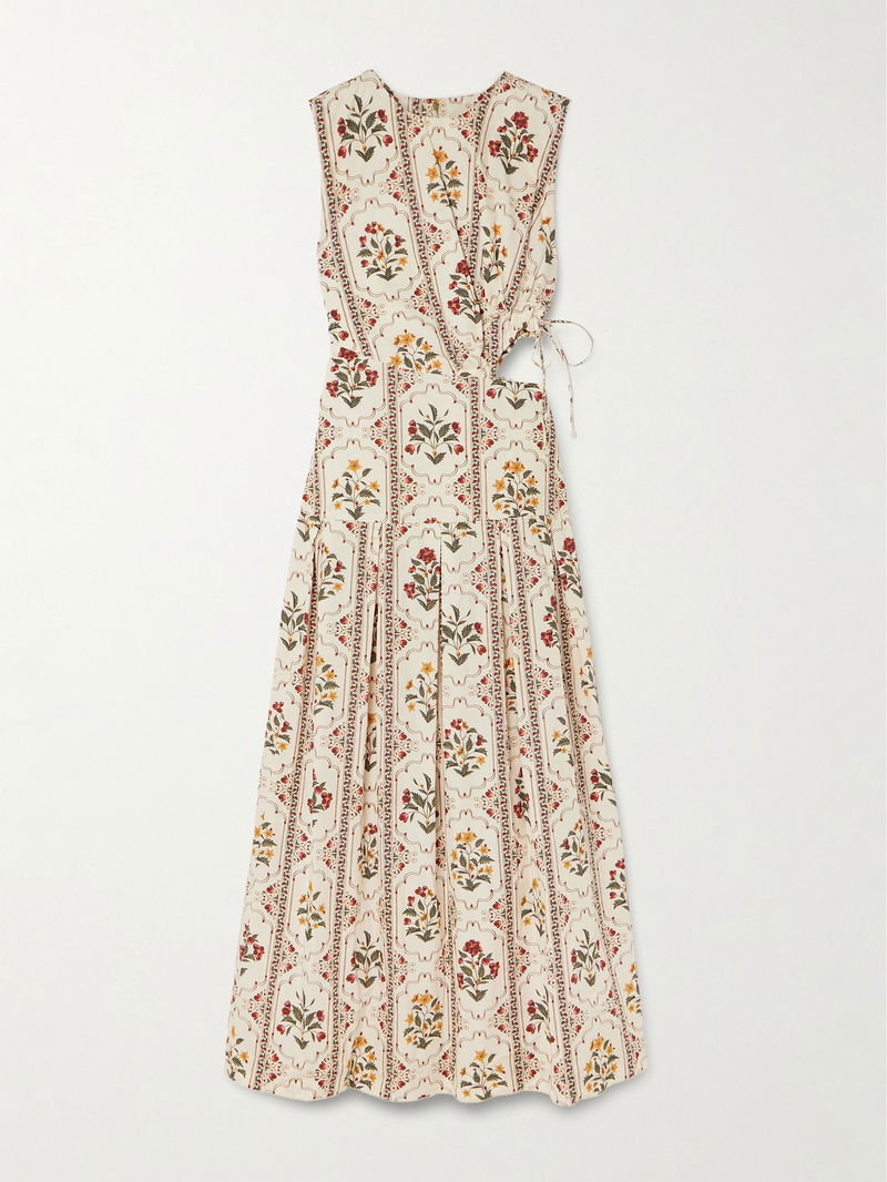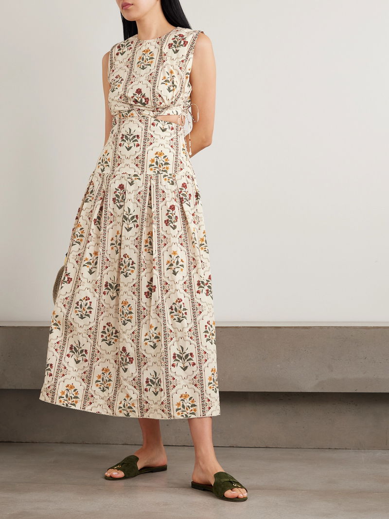 Made from breezy cotton, it's patterned with delicate florals and has a cutout at the hip that cinches with faux pearl-tipped ties. Lift the midi hem with platform espadrilles.