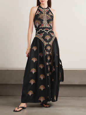 Suspended from slim straps, this embroidered 'Soledad Bougainvillea' dress is cut in a flowy shape from breathable linen and has a plunging V-neckline at the front and back.