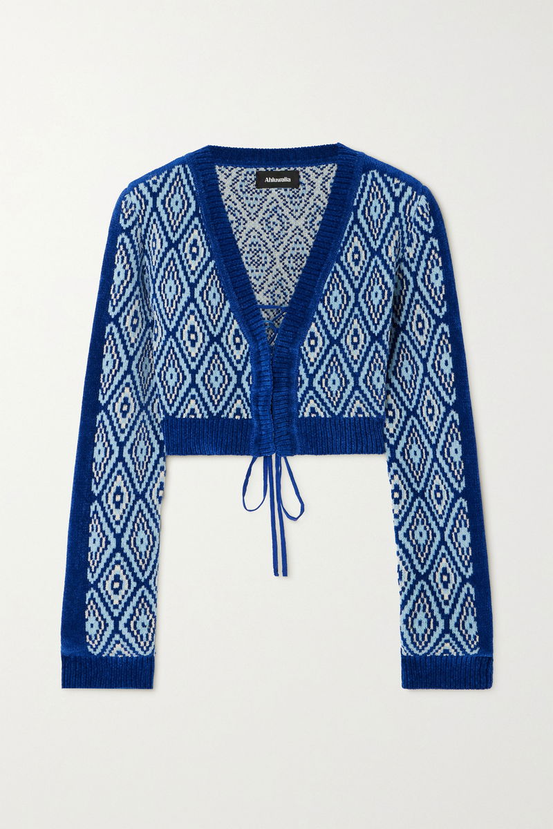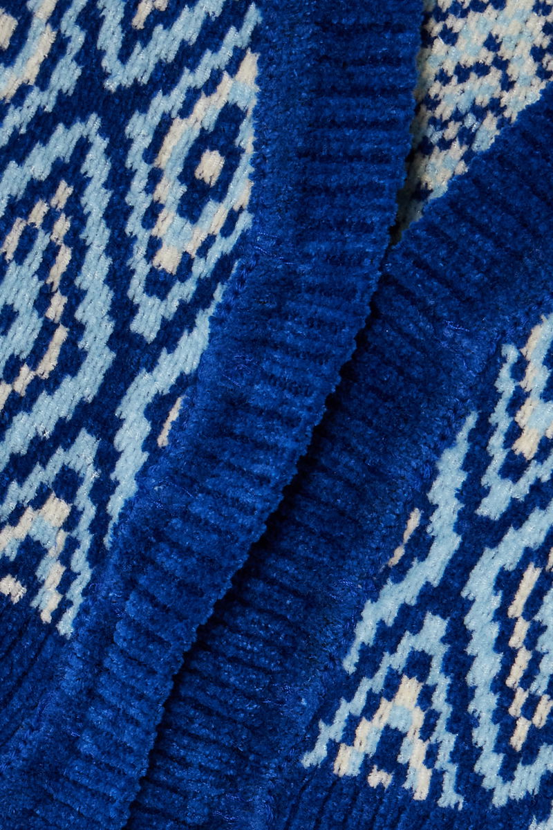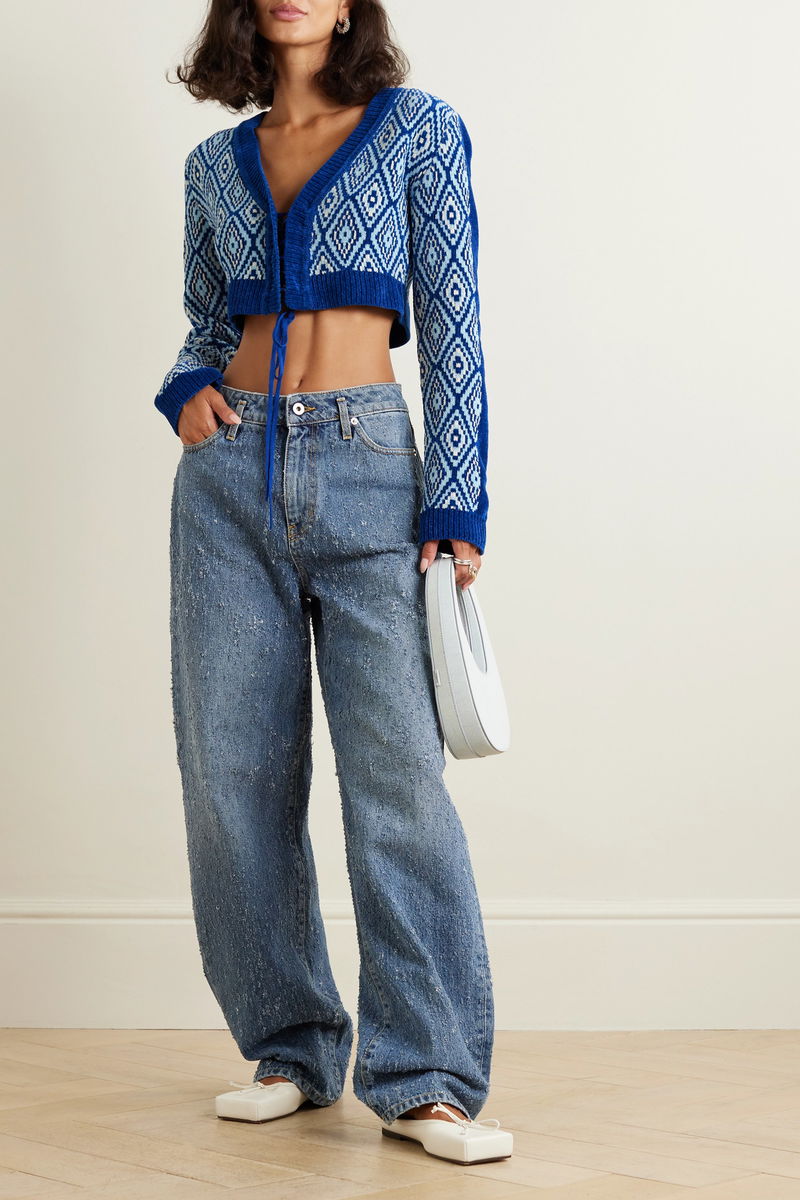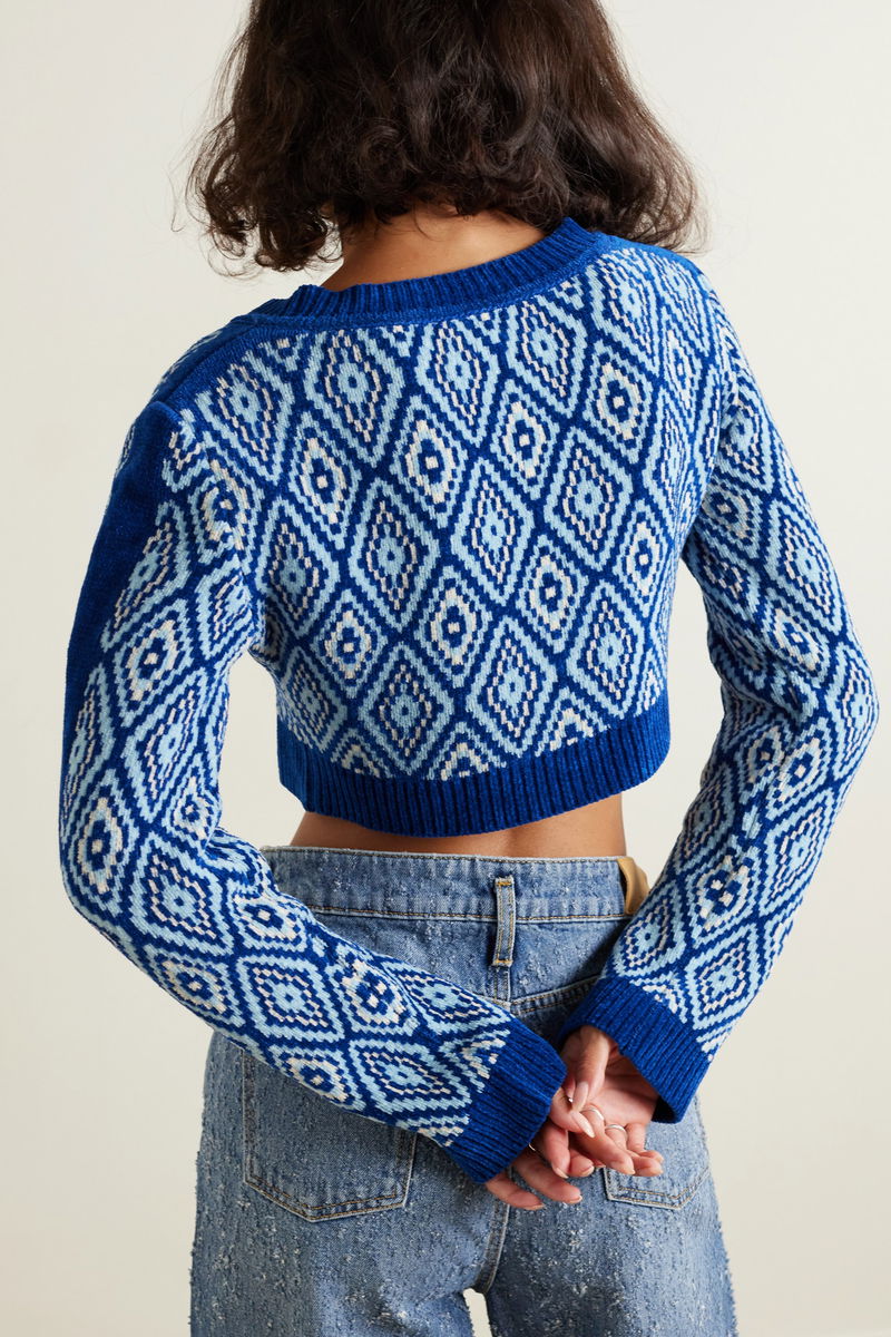 Priya Ahluwalia's Fall '23 collection is titled 'Symphony', which explains the musical inspiration behind this 'Vixen' cardigan. Spun with generous amounts of cotton, the tonal-blue jacquard-knit is woven with a diamond pattern seen on vintage guitars, while the gold rings mirror those on Indian Dholak drums.