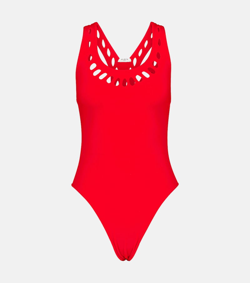 Bring Alaïa's impeccable designs to the poolside with this elegant red swimsuit. The racerback style is made from stretch-fused swim fabric and detailed with the house's signature cutouts at the neckline and back.