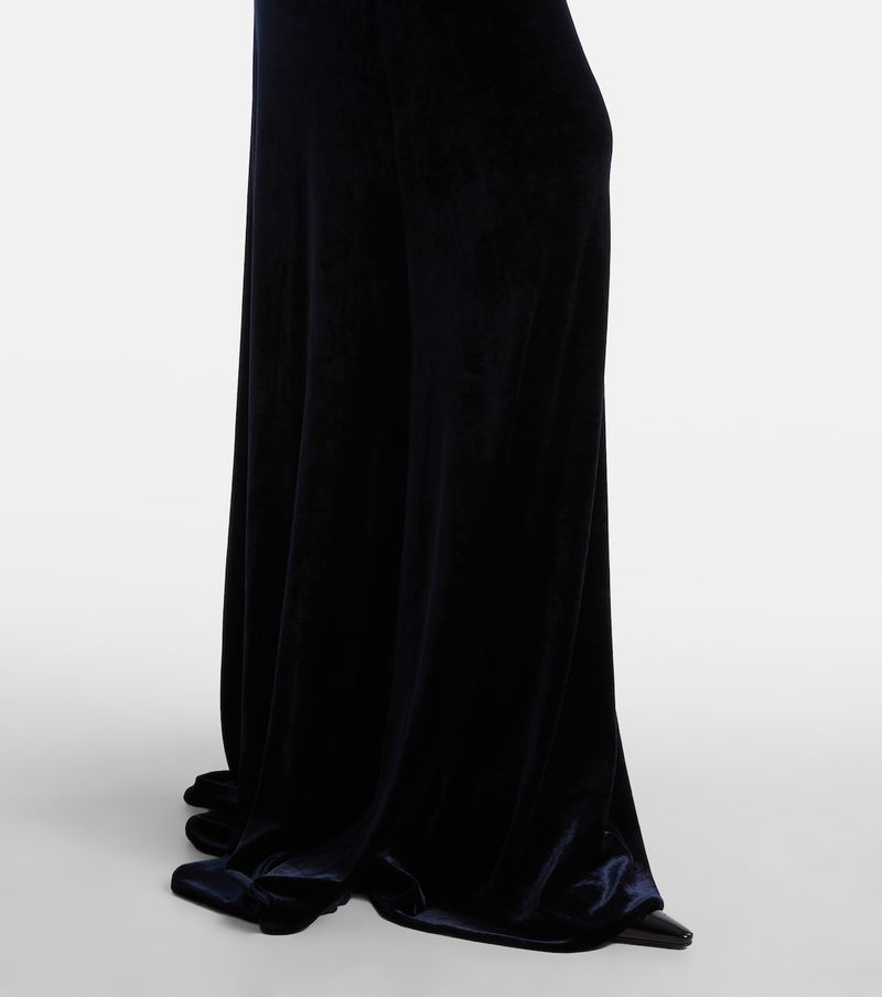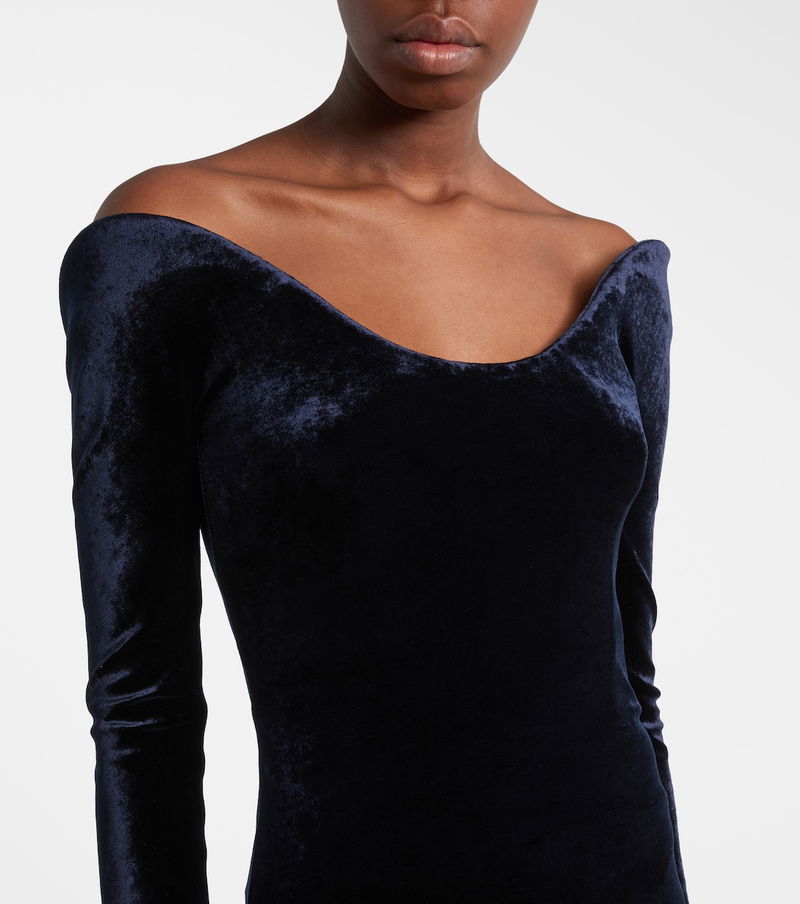 Upholding the legacy of Azzedine Alaïa, the maison’s collections achieve an artful balance between sculptural and wearable. Crafted from a lustrous velvet, this gown stands out with a curved, off-shoulder silhouette and an open back.