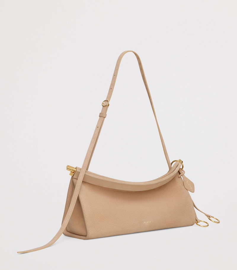 Alaïa's signature lies in its exploration of shapes and curves, a distinctive architectural approach that permeates its accessory line. A prime example is the Le Click East West shoulder bag, instantly recognisable by its curved, body-hugging silhouette and unique leather-wrapped hinge opening system.