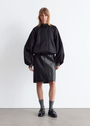 Closure: two-way zipped front. Pockets: side slit pockets.