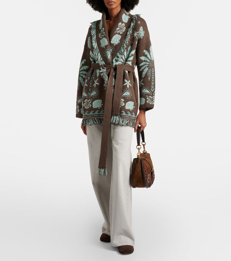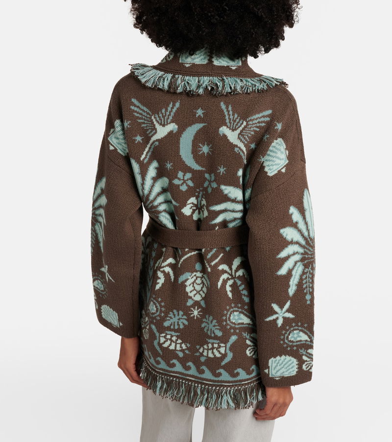 The Echoes Of The Island cardigan by Alanui features an allover foulard motif in a double jacquard knit. Knitted in Italy from a cotton and wool blend, the piece comes with a matching belt and fringed edges.