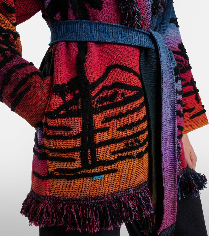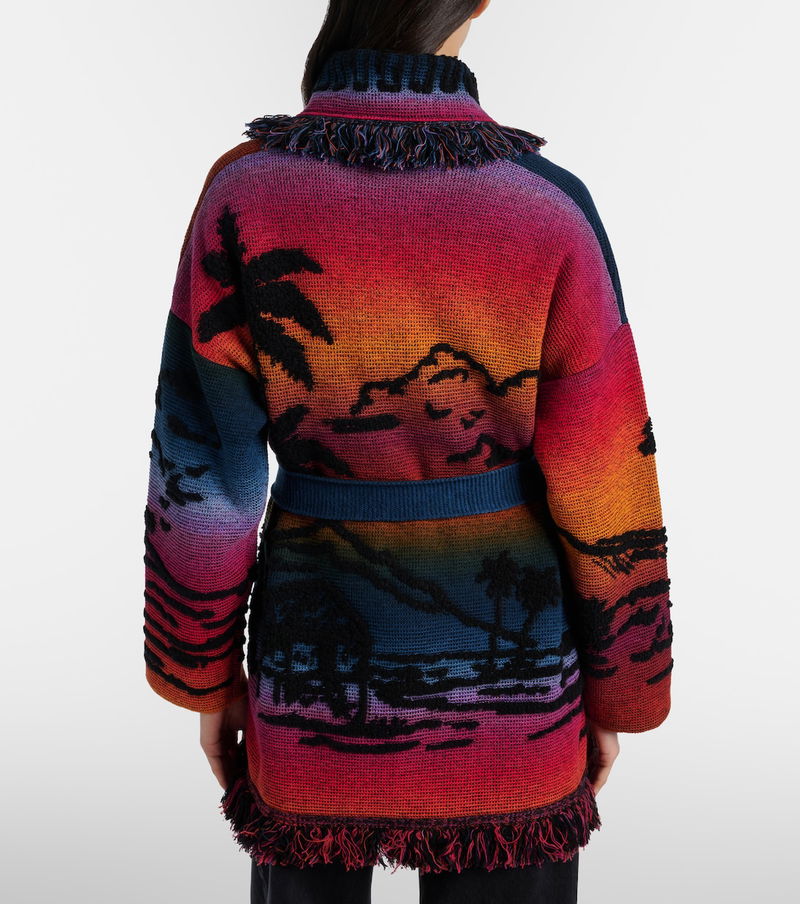 The Sunset Stories cardigan from Alanui is crafted from a soft blend of cashmere, cotton, and wool. This vibrant design showcases a jacquard landscape motif, complete with shawl lapels and fringed detailing along the edges.