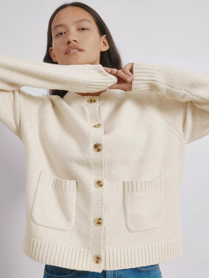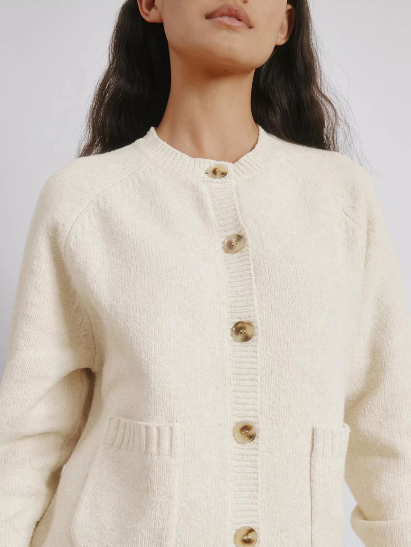 This cosy pocket crew cardigan is the perfect addition to your wardrobe, providing both warmth and comfort with its wool blend material. The deep rib cuffs and hem, paired with horn-effect buttons and patch pockets, create a timeless and elevated design. A must-have for any functional and versatile wardrobe.