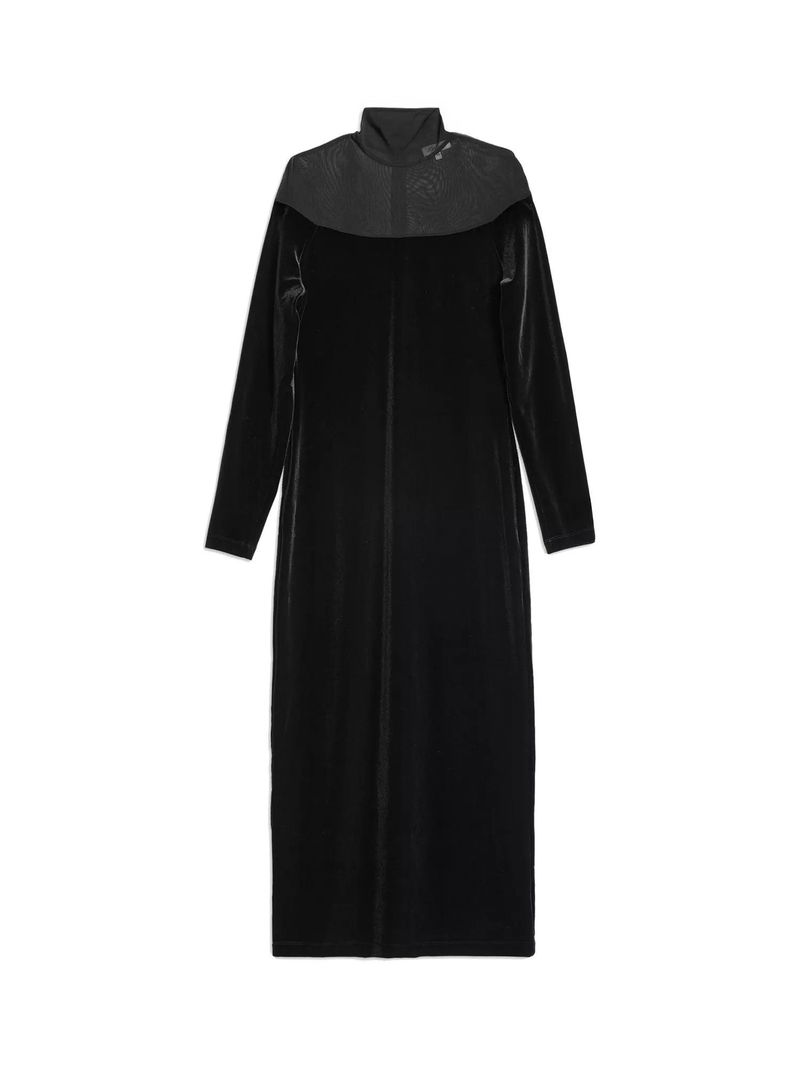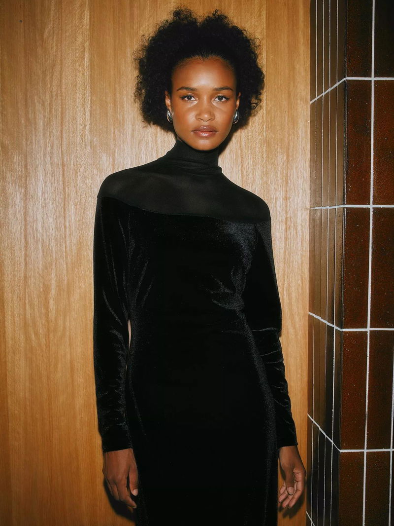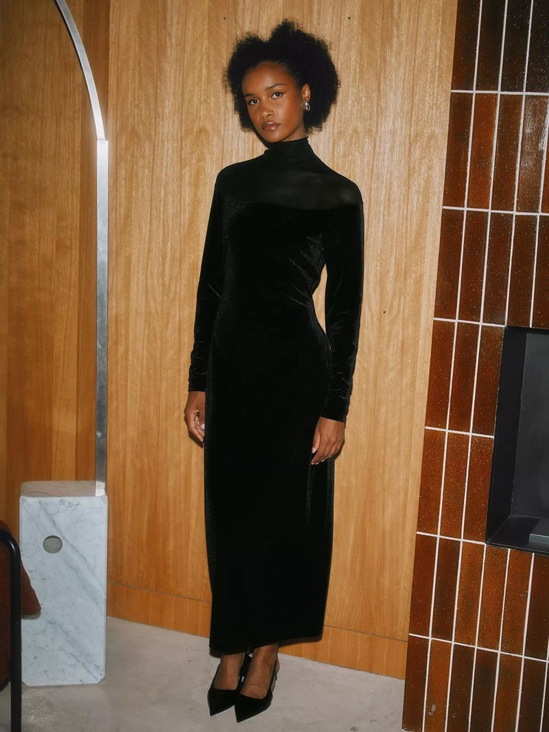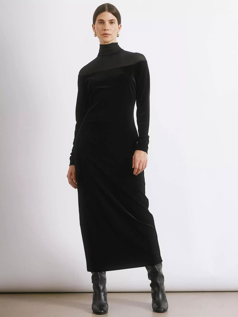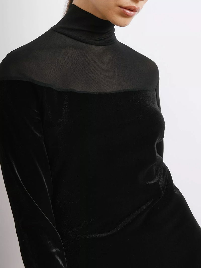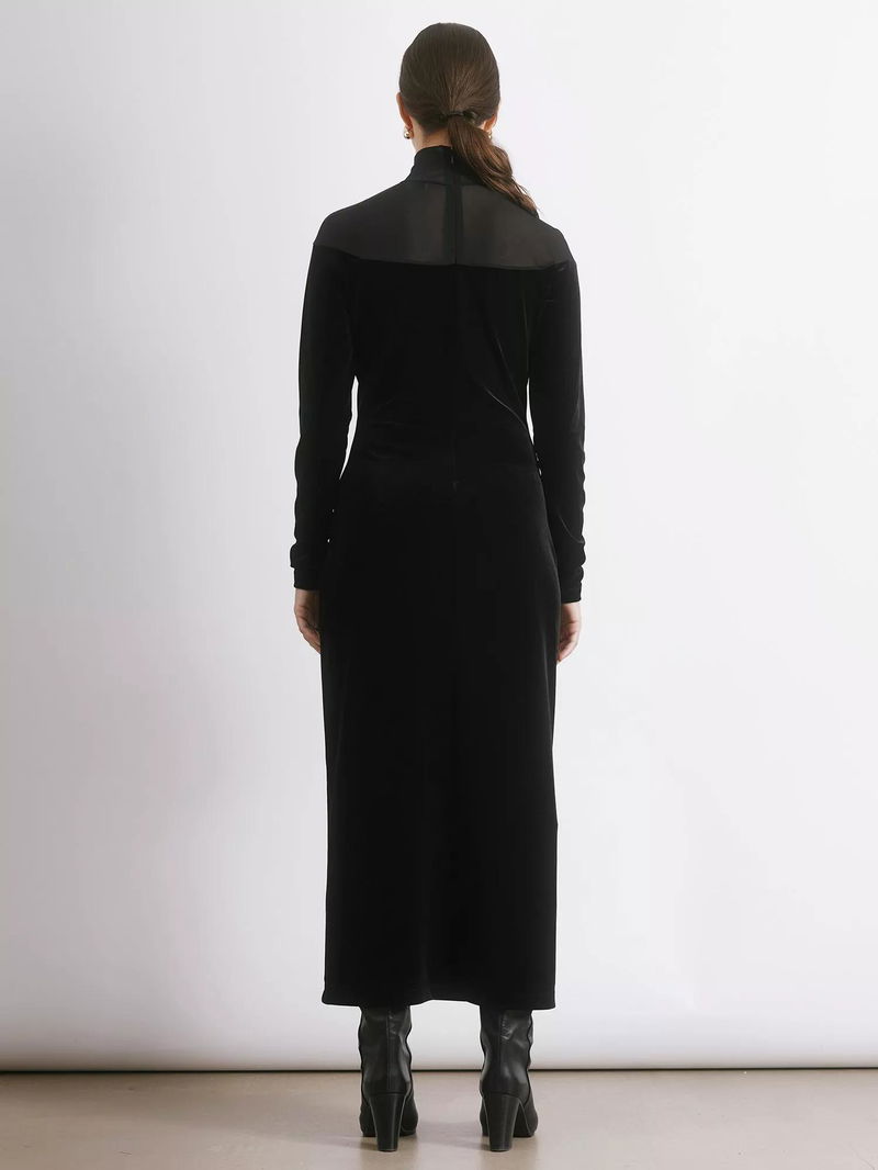 This mesh and velvet midi dress combines elegance with comfort, featuring a stretch velvet fabric that moves with you for a flattering fit.