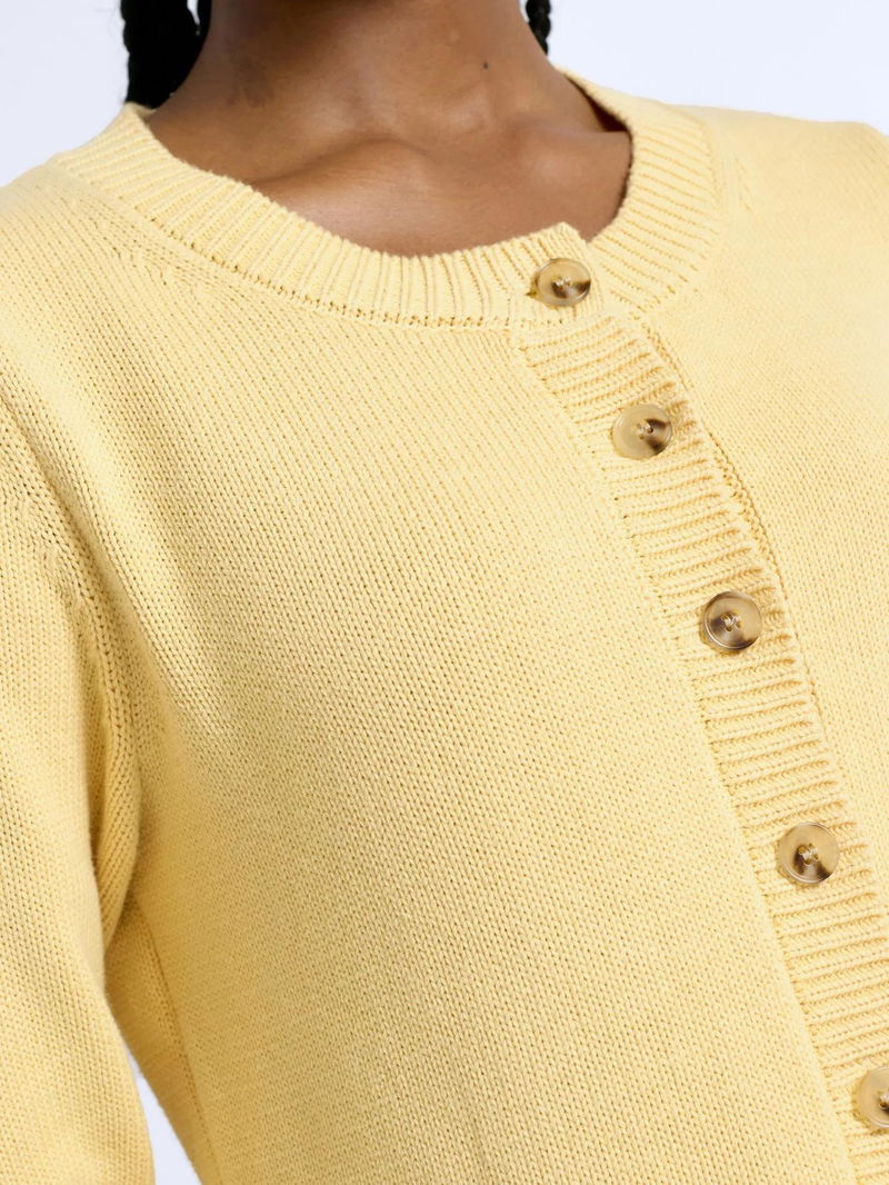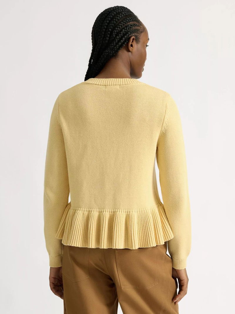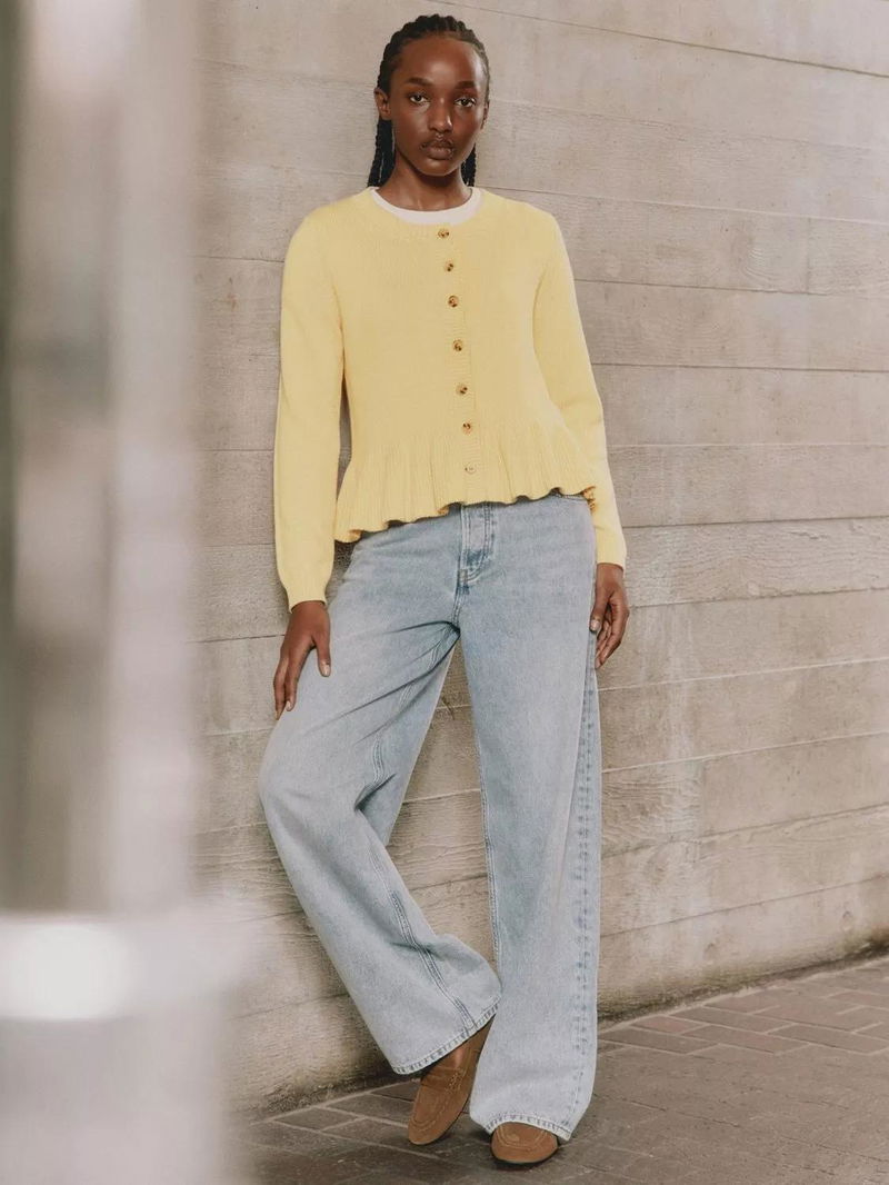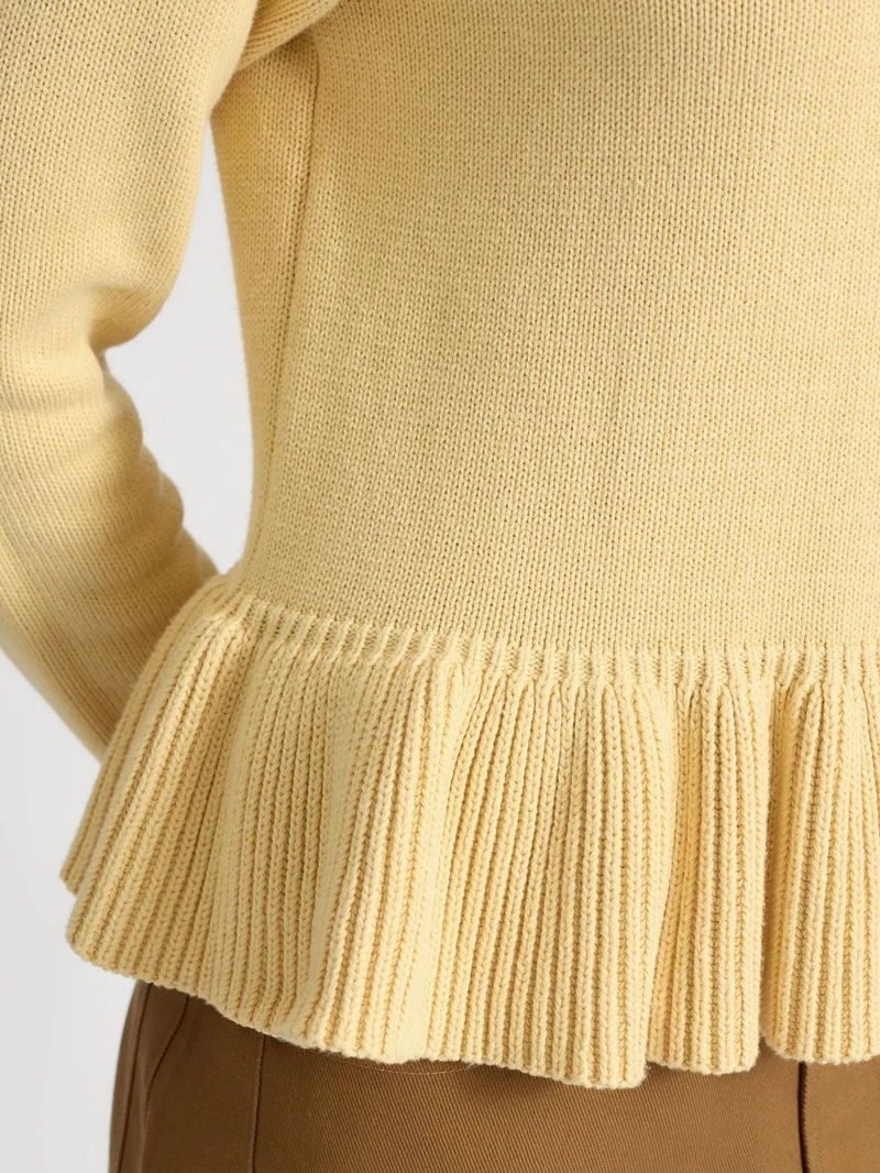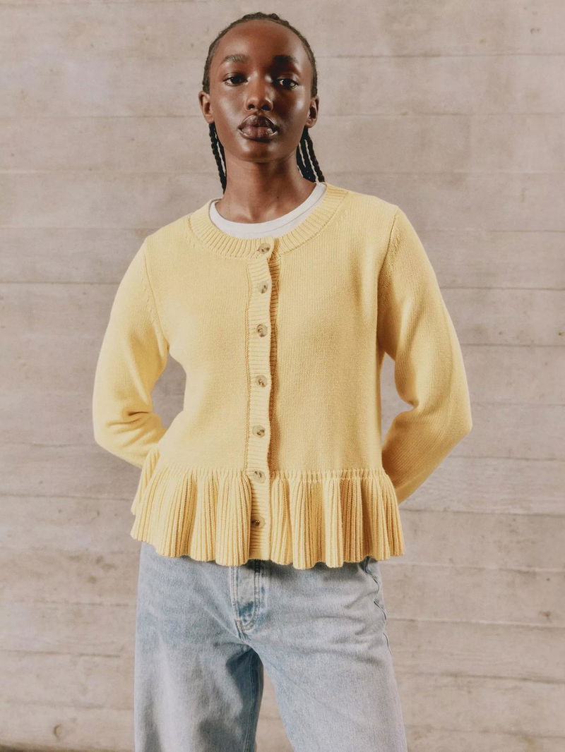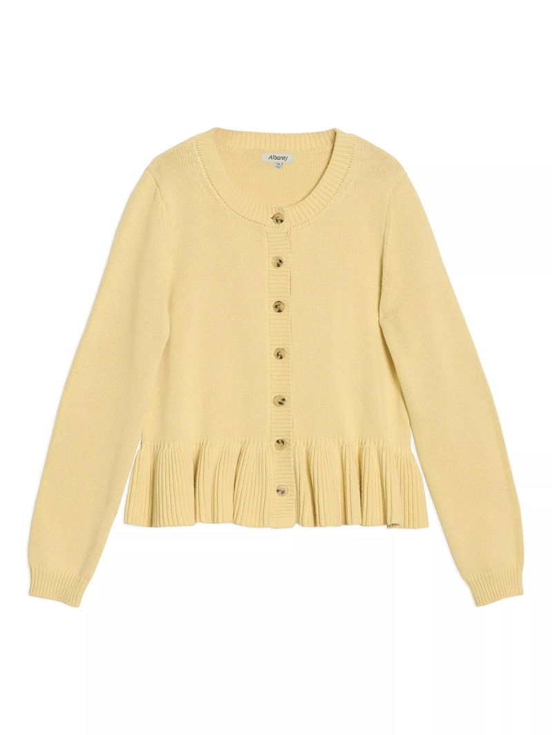 A cardigan knitted in a cotton yarn, beautifully detailed and finished with a flattering ribbed peplum hem.