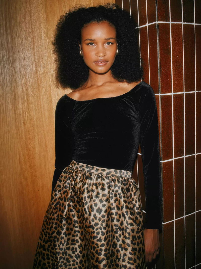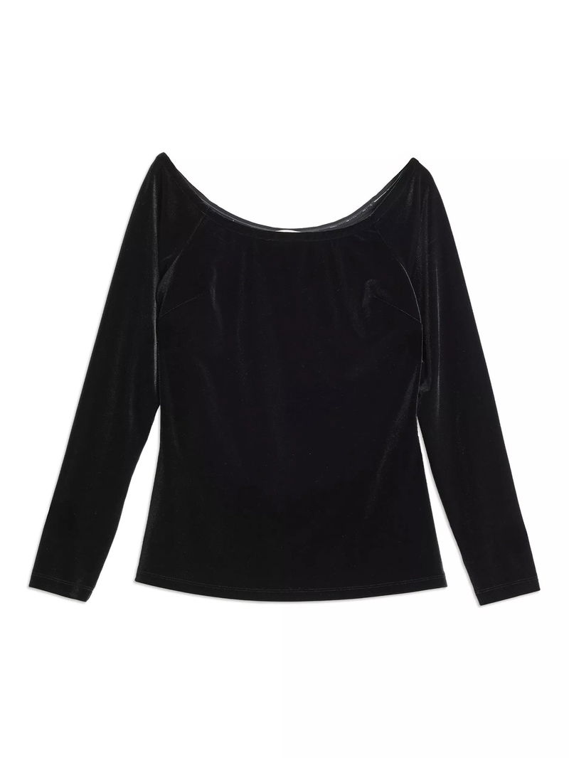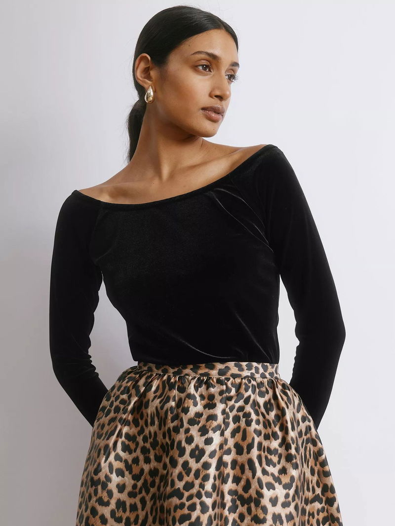 This Bardot top is crafted from stretch velvet, featuring a neckline that enhances your natural shape with elegance.