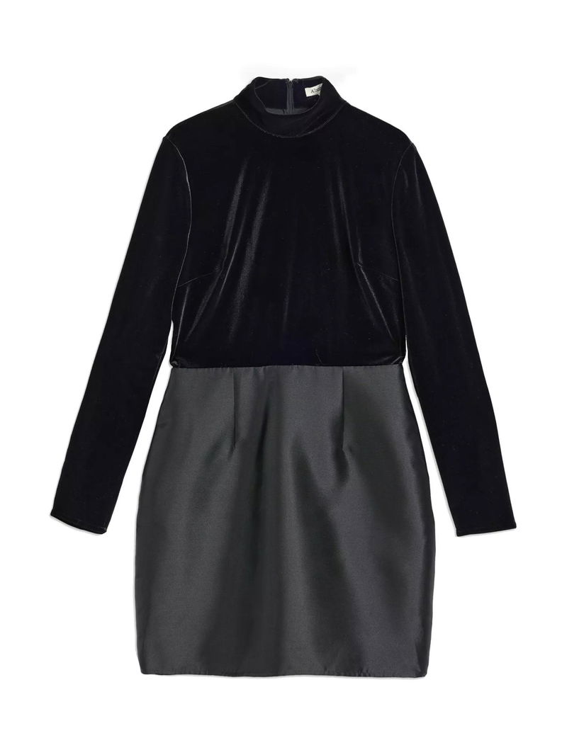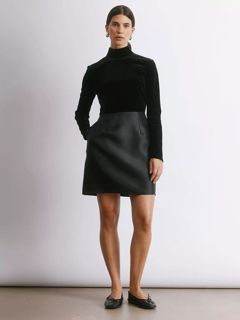 Step out confidently in this elegant black dress, designed with a comfortable stretch velvet top and a smooth funnel neckline, complemented by a flattering short taffeta skirt.