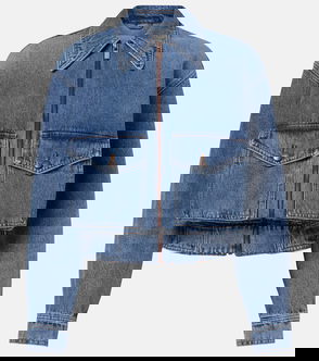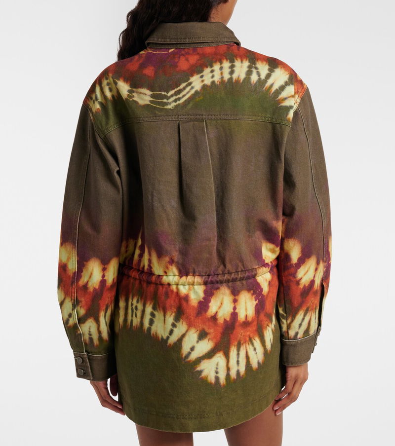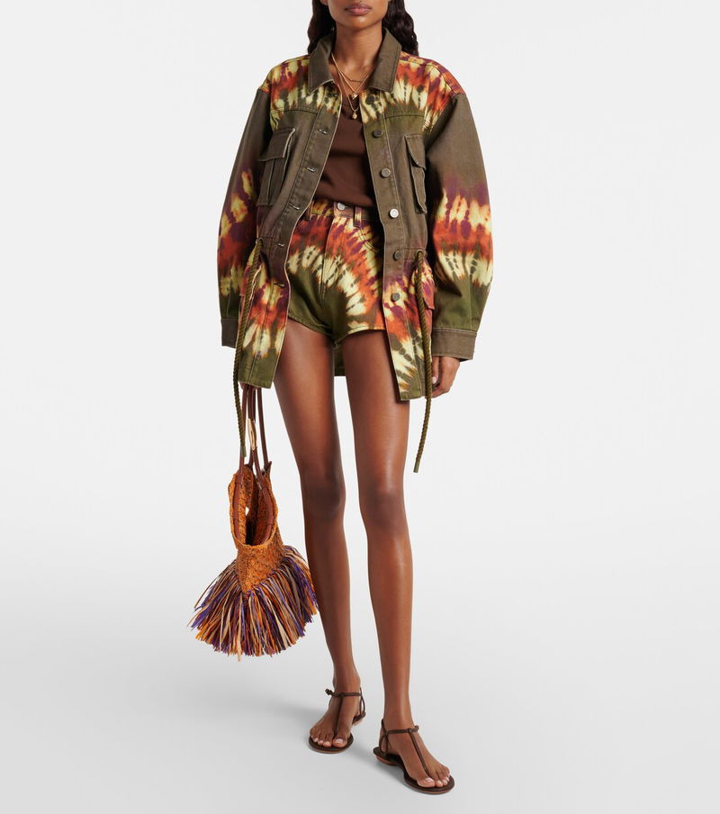 A contemporary brand with an artisanal focus, Alémais celebrates the art of fashion through an eclectic mix of patterns and prints. The Marilyn denim jacket is shaped into a relaxed silhouette with a belted waist, pointed collar, and colorful print allover.