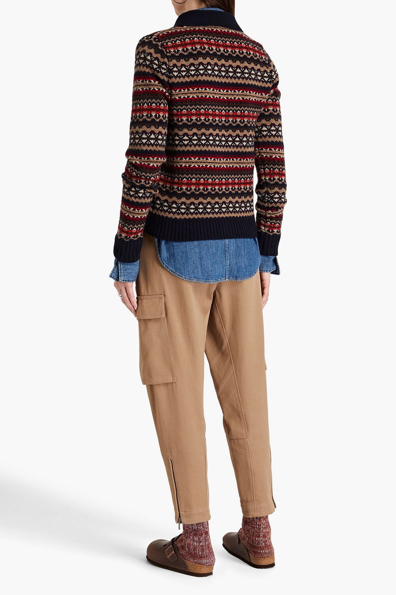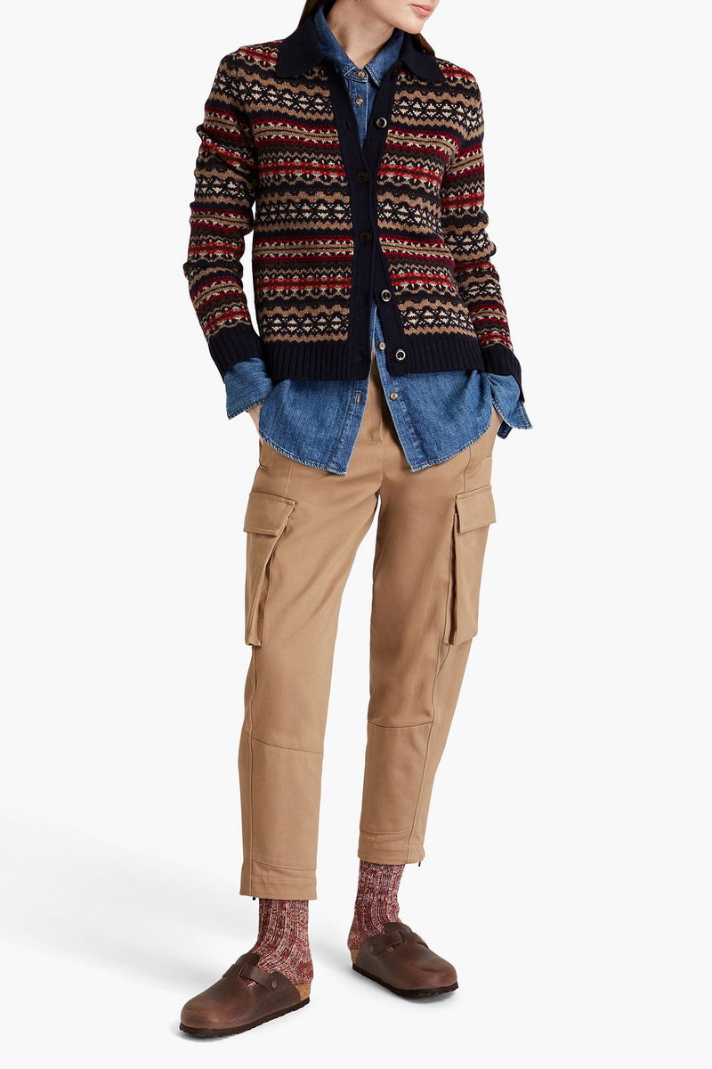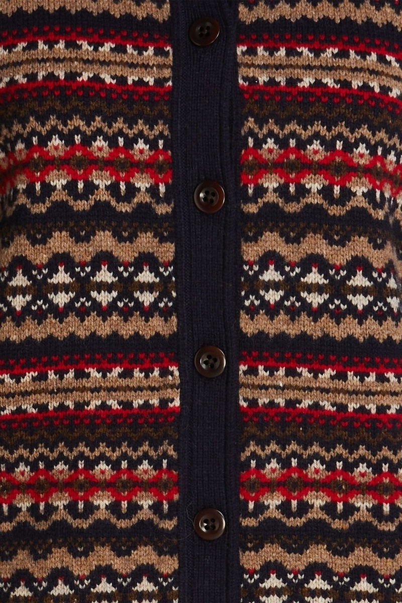 Cardigan, Fair Isle, Wool, Ribbed trims, Button fastenings through front, Mid-weight knit.