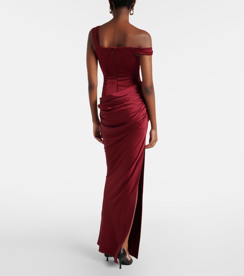 Standout in Alex Perry, whose designs are known for their sharp, refined impact on the red carpet. Cut from pink crêpe satin, this bustier gown features a one-shoulder silhouette, a sweetheart neckline, and layered hip draping.
