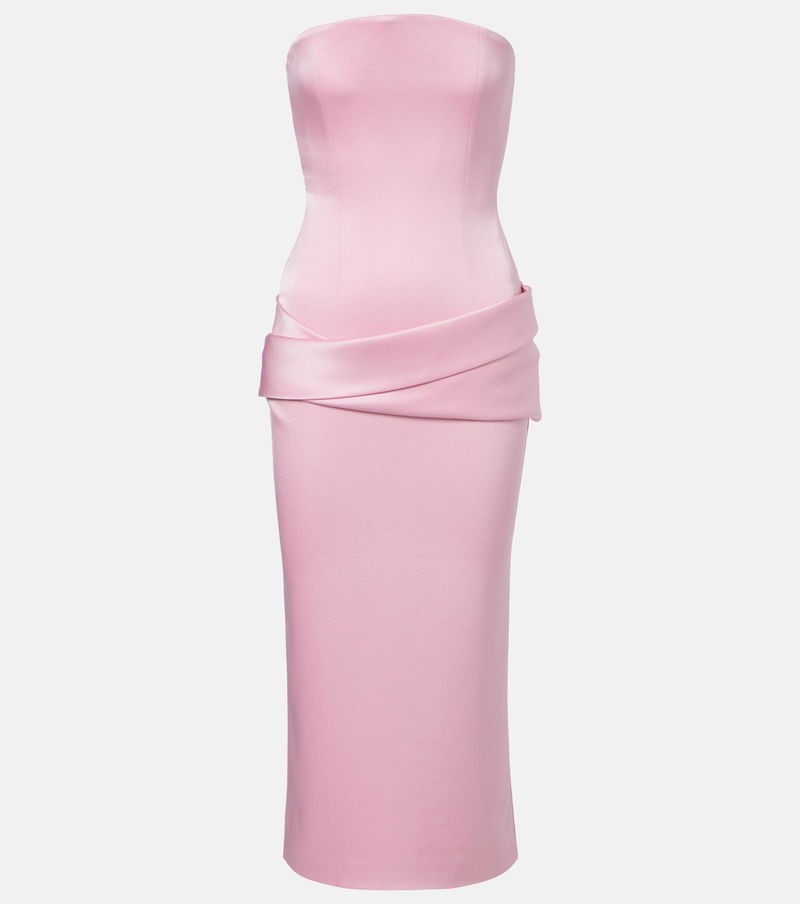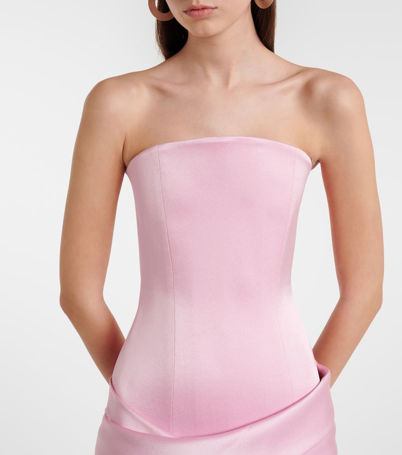 Standout in Alex Perry, whose designs are known for their sharp, refined impact on the red carpet. Cut from lustrous satin crêpe, this bustier dress features a curved, strapless neckline and layered hip draping.