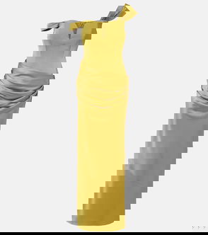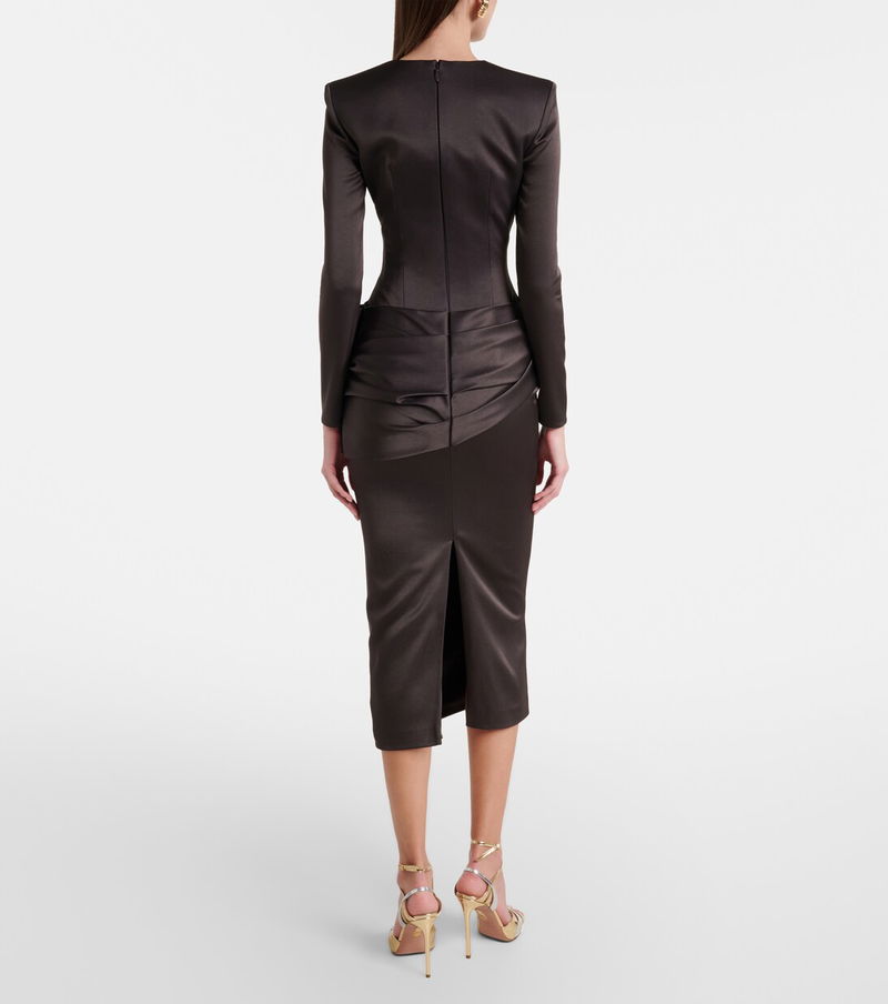Standout in Alex Perry, whose designs are known for their sharp, refined impact on the red carpet. Cut from brown satin crêpe, this cocktail dress features long sleeves with padded shoulders and layered hip draping.