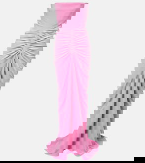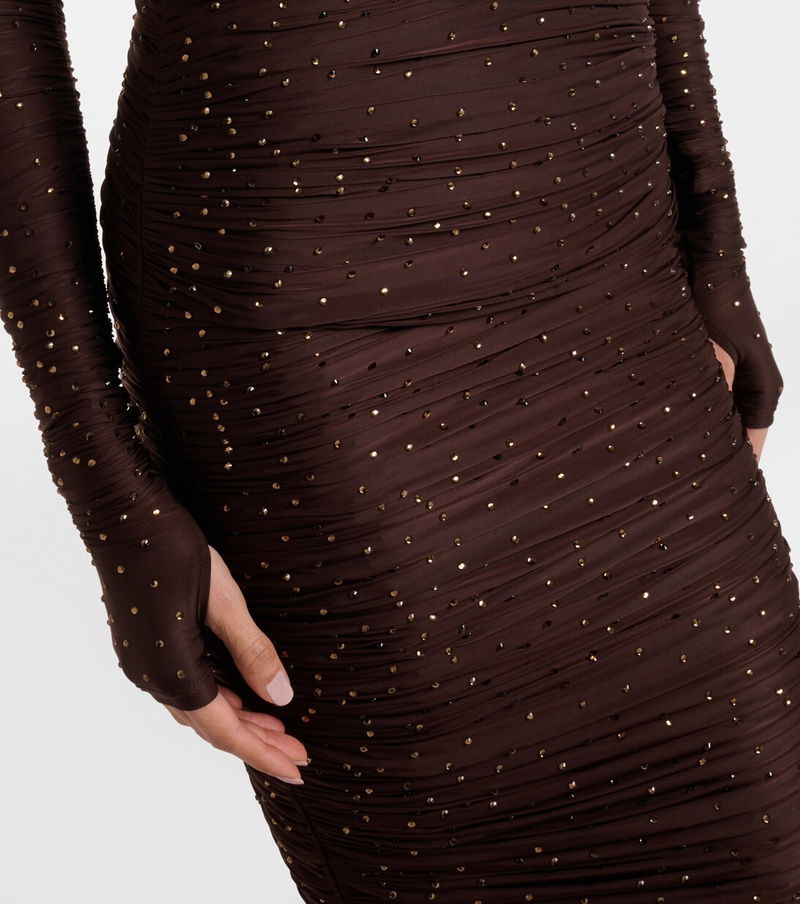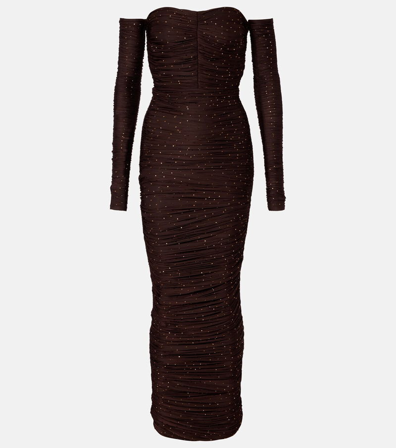 Standout in Alex Perry, whose designs are known for their sharp, refined impact on the red carpet. This jersey gown sparkles with its crystal embellishments and features detachable long sleeves and all-over ruching.