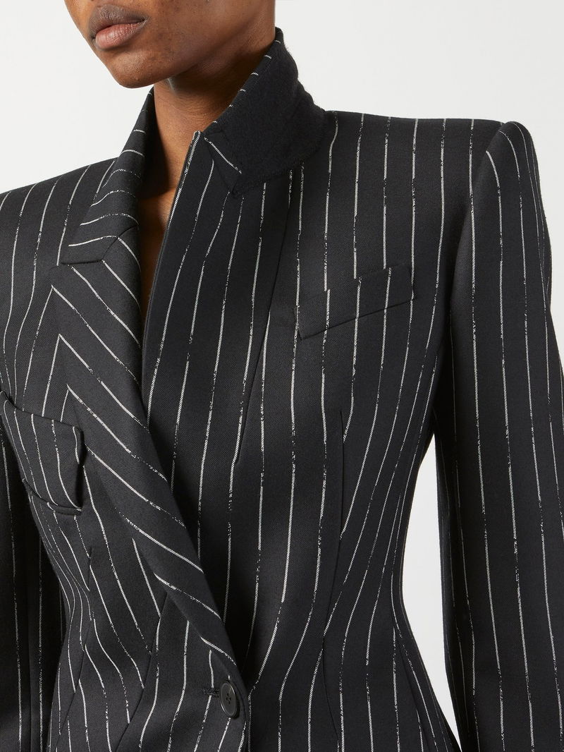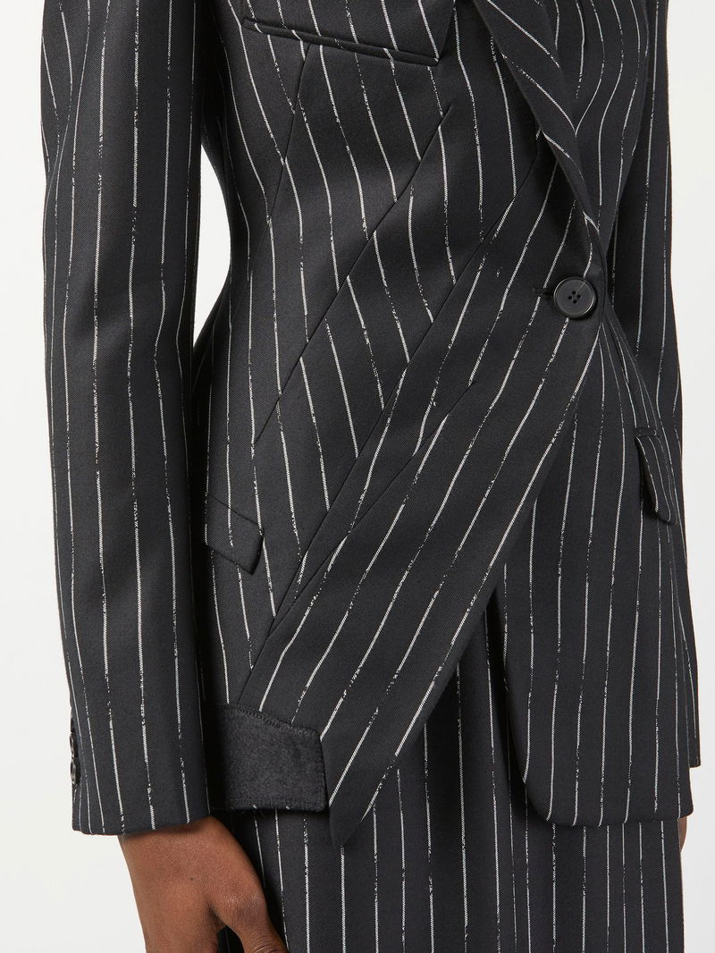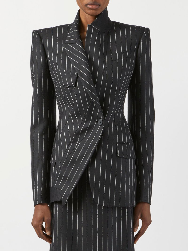 Embrace Alexander McQueen's avant-garde aesthetic with this black wool-twill suit jacket, seen in the asymmetric profile and distressed pinstripe print.