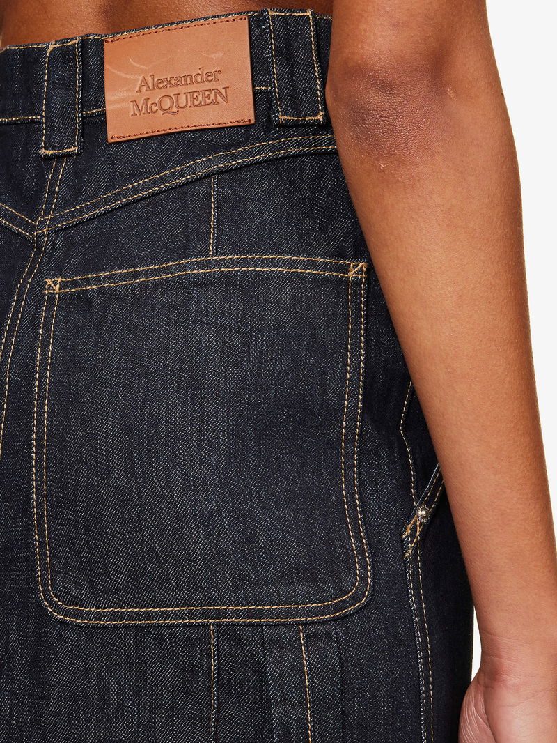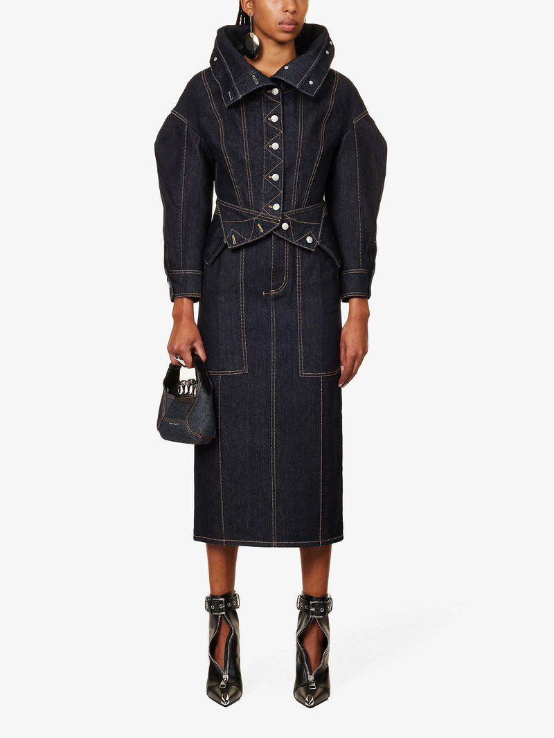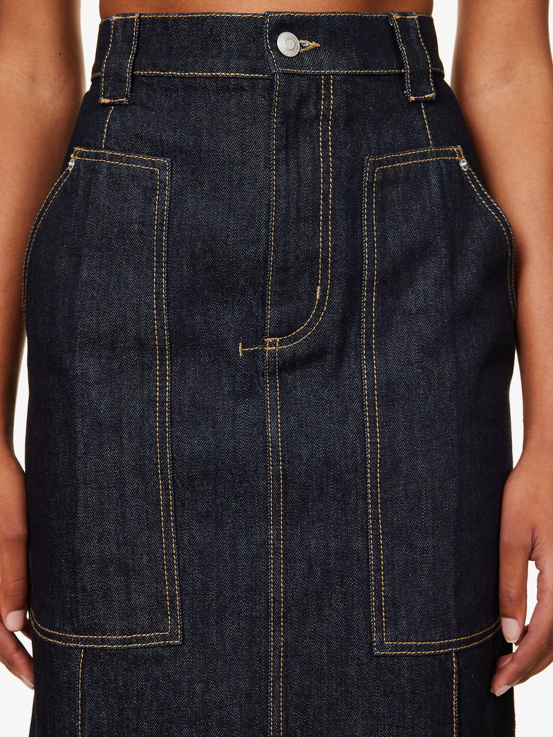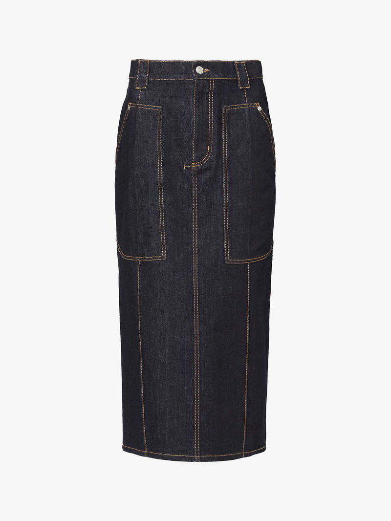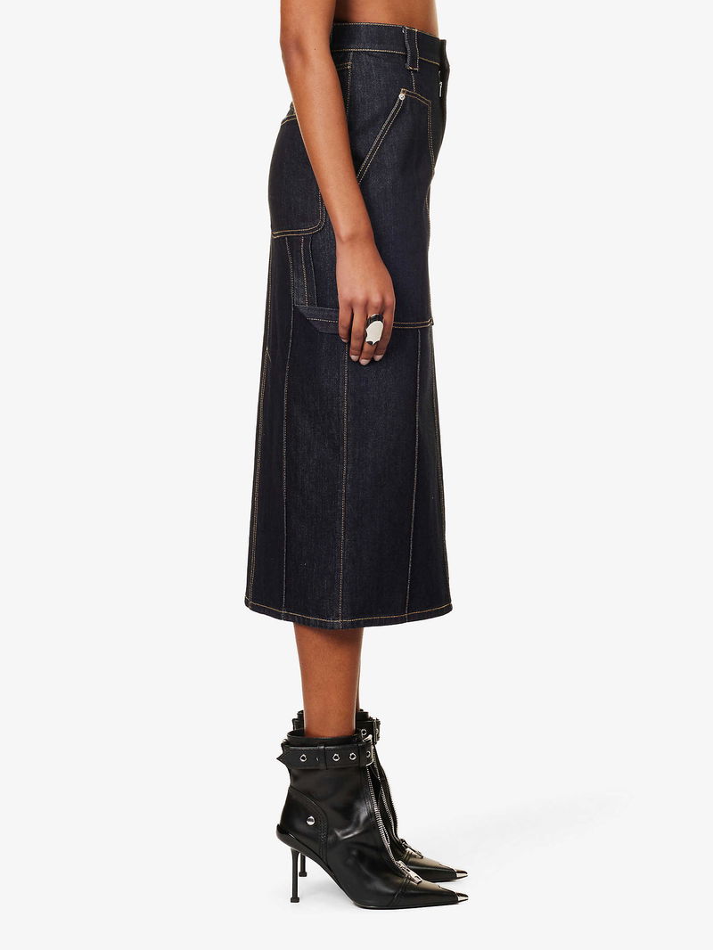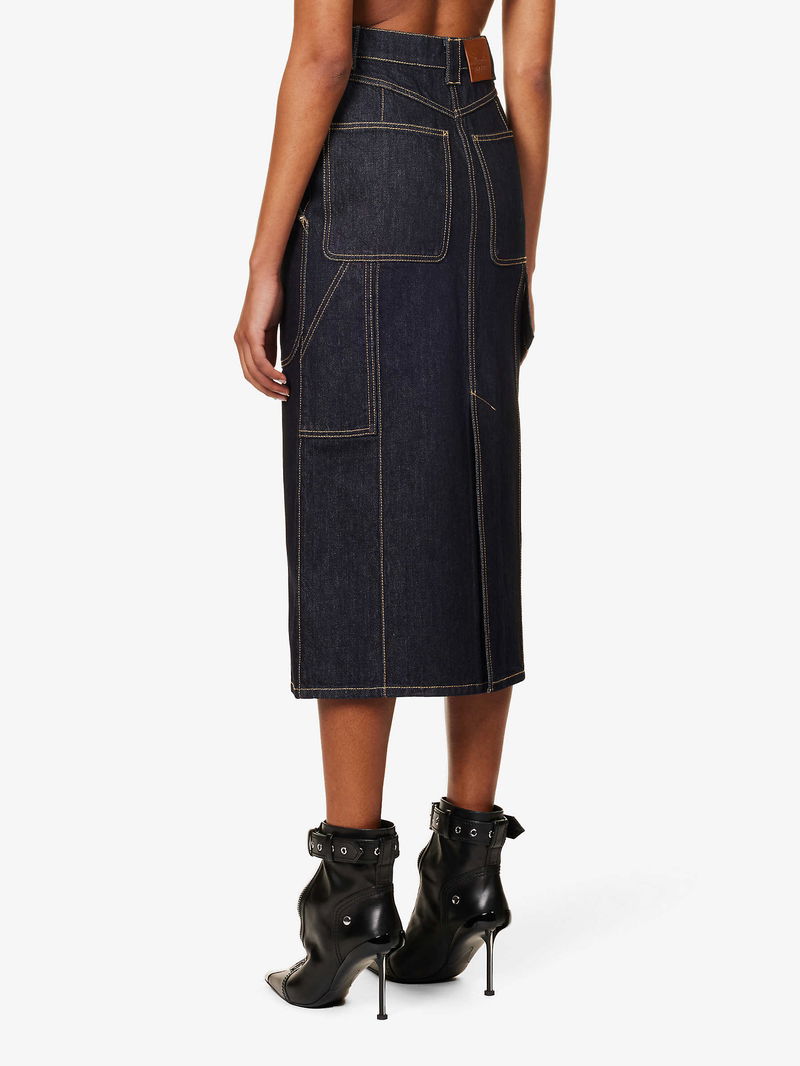 Alexander McQueen denim midi skirt. Exposed button and concealed zip-fly fastening at front Regular fit, mid-rise, structured waistband with belt loops, two slip pockets at front, two patch pockets at back, brand patch at back, mid-wash, contrast stitching, split hem, branded silver-toned hardware.