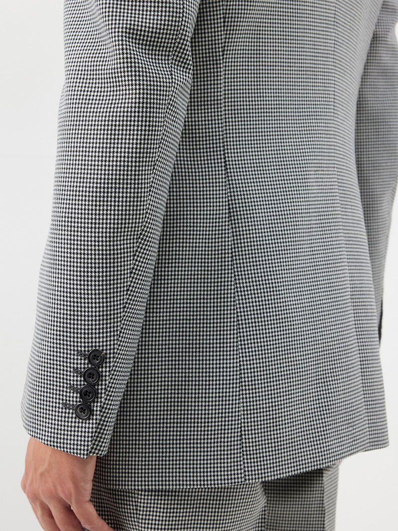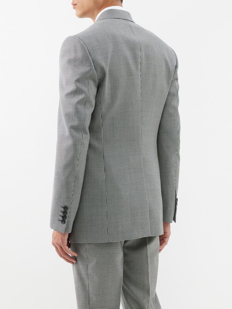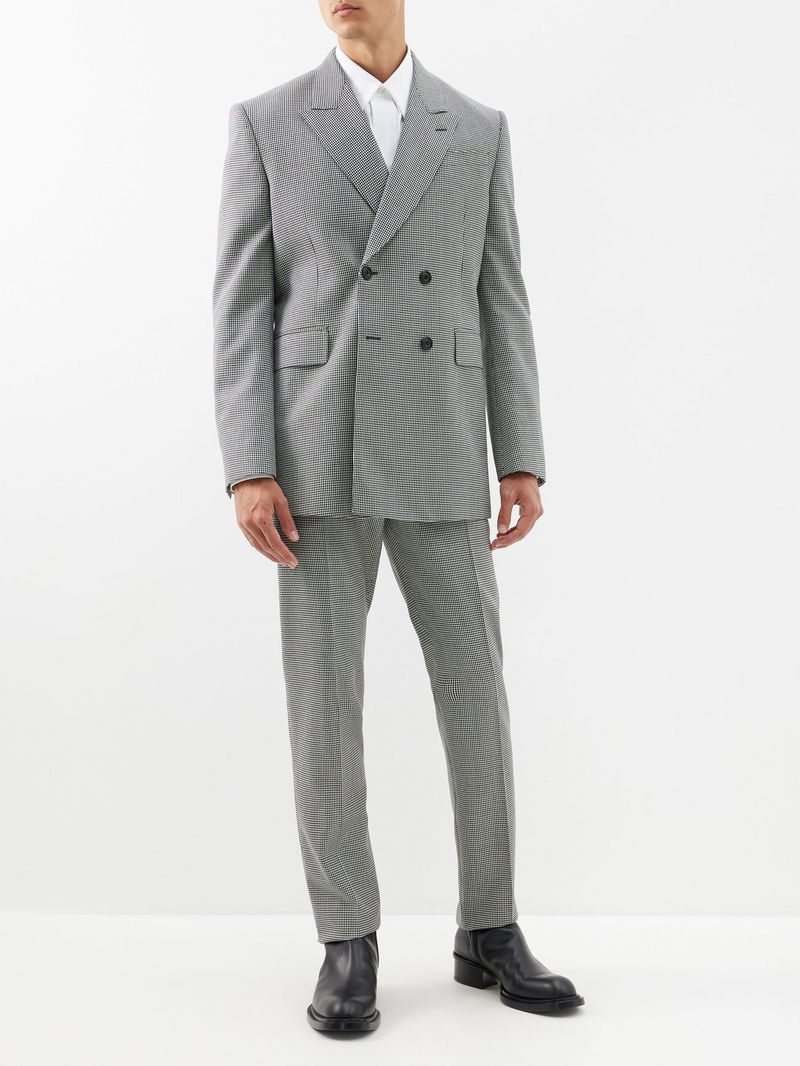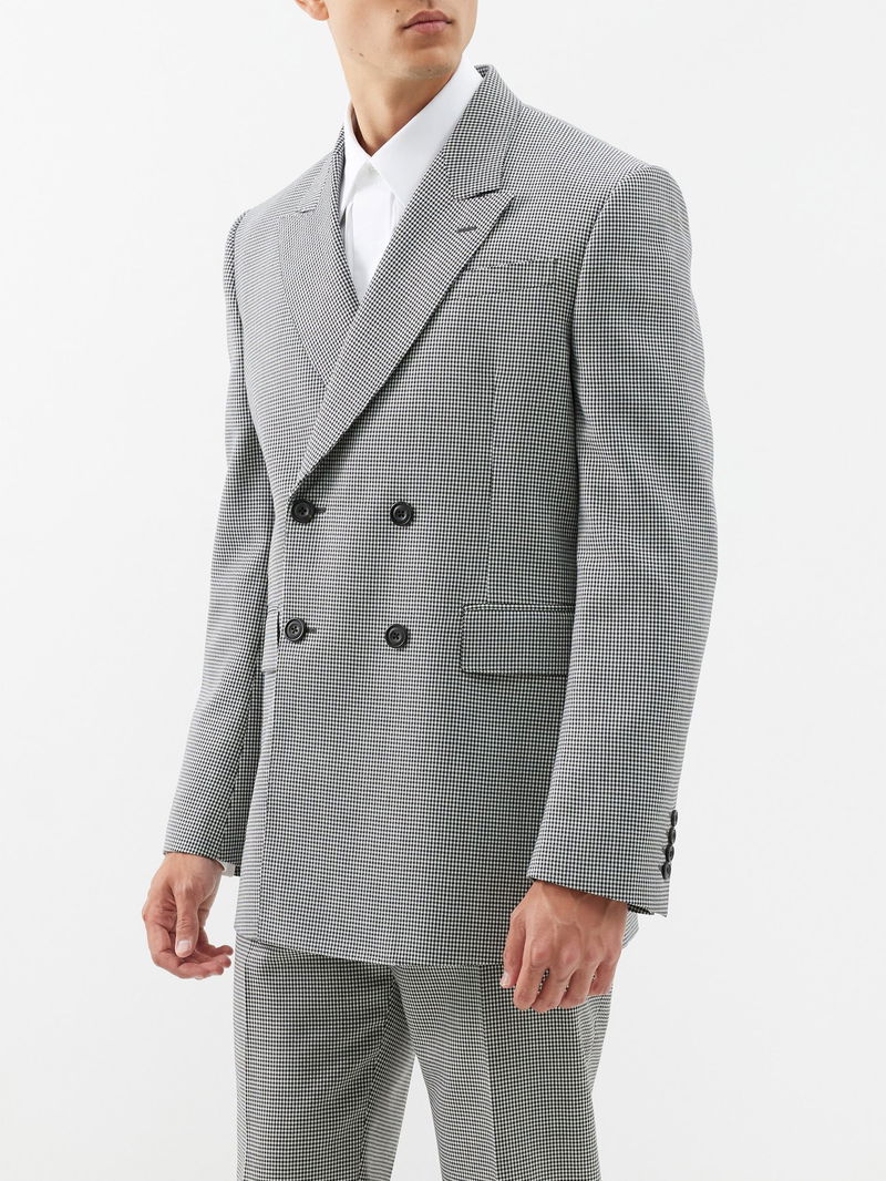 Presented in Alexander McQueen's AW23 lookbook, this black and white double-breasted jacket is tailored in Italy from wool woven in a traditional houndstooth pattern.