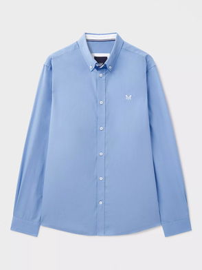 Alexander McQueen’s white short-sleeved shirt is made from crisp cotton poplin with a blue dancing skull print, echoing the label’s playful sensibilities.