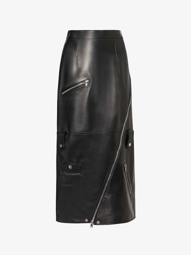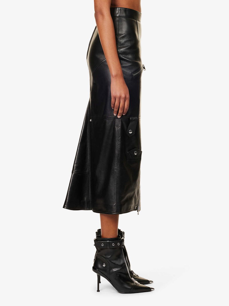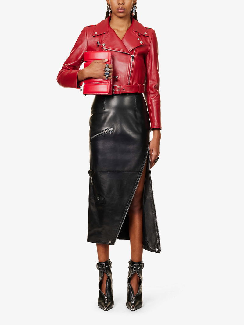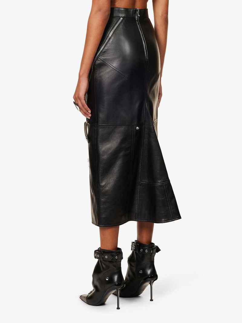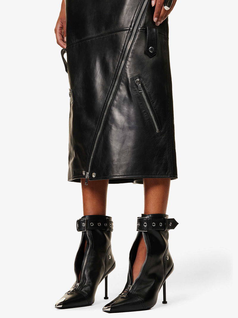 Whether its spine-tingling skeletons peeping from the panels of scarves or slinky gowns that drape over your silhouette with a whisper weight, the alchemy of Alexander McQueen remains unmistakable: a subtle fusion of beauty and dark romanticism. Plucked from the label’s AW23 collection, the Slashed midi skirt is crafted from panels of glossy leather, fashioned to a waist-nipping, mid-rise fit and stitched with a scattering of silvery zips to stir the label’s spirit of rebellion.