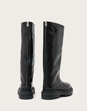 Equestrian-inspired with an AllSaints edge. The Rhye Boot features an industrial metal buckle against the smooth black leather body.
