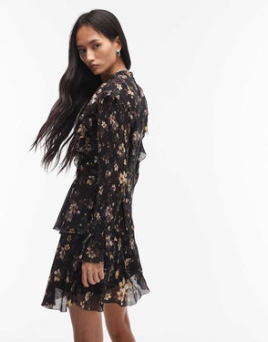 Florals. And geometric shapes. In lace. The Briella Dress. One for events. Mini silhouette. With a tiered body. And high neck.