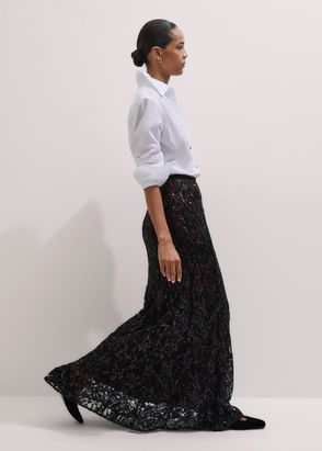 This is the Cadell Skirt. It's new for the season. Sitting mid-to-low rise, the easy ribbed fabric is shaped to a cool maxi length. Hook and eye closures decorate the front and create a gathered effect and a flattering drape. You can also adjust the closures to create a fit that works for you. It's a laidback look that goes from day to night with ease - pair with a boxy tee and leather jacket.