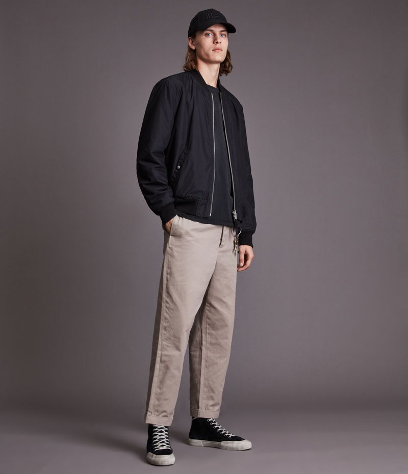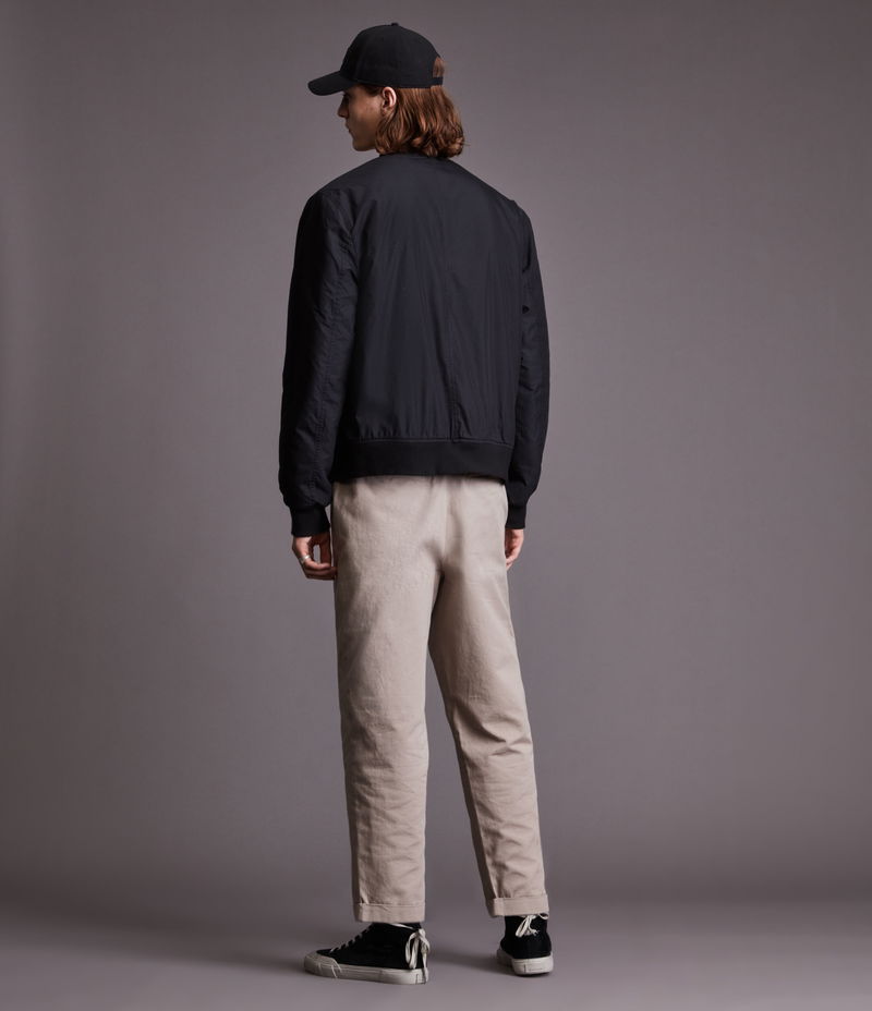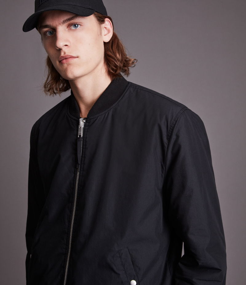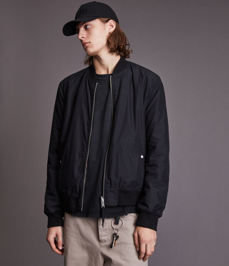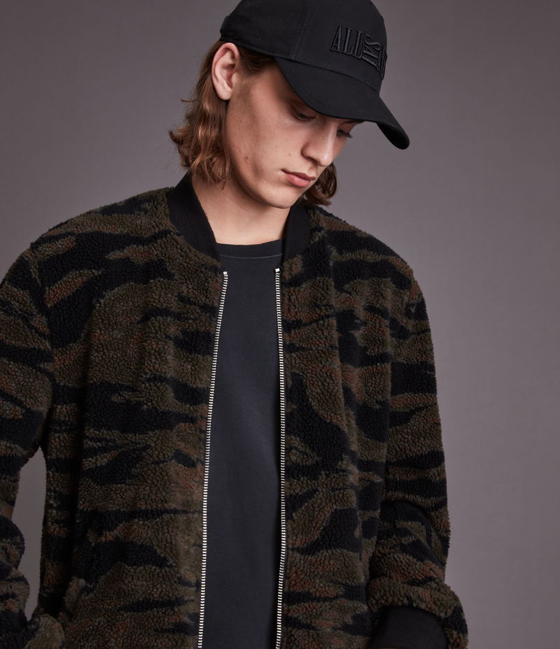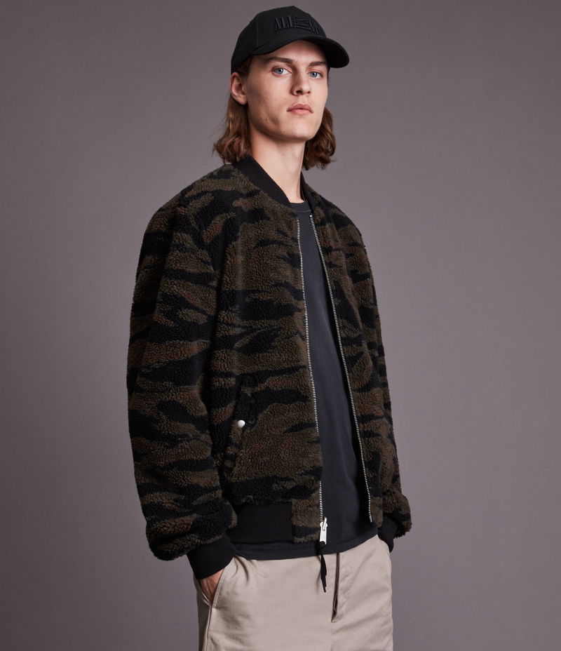 Switch it up and reverse it. The Cameo Bomber Jacket. Covered in a textured, faux-sherpa camouflage print. Black cotton twill on the other side. Wear it either way.