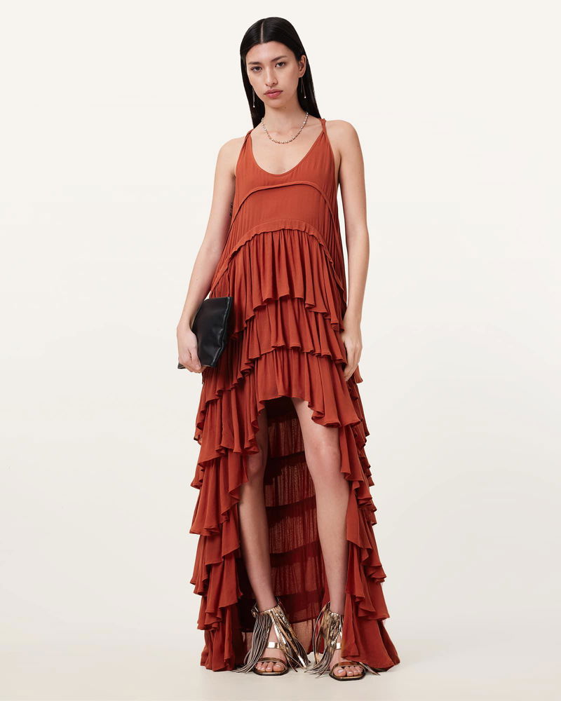 We're thinking... ruffles. The Cavarly Dress amplifies that feminine feeling. The lightweight fabric is shaped to a relaxed fit with a low scooped neckline and flattering waistline. The skirt is full of volume and layered with three heavily ruffled tiers that cascade to a maxi length. A bit of drama, but always playful, this statement dress goes from season to season.
