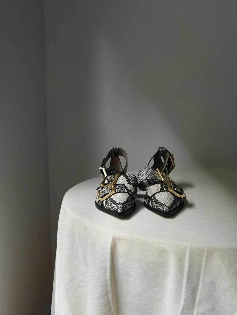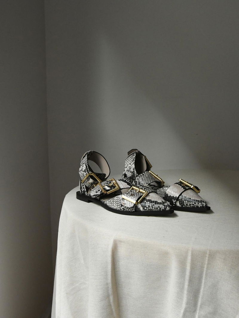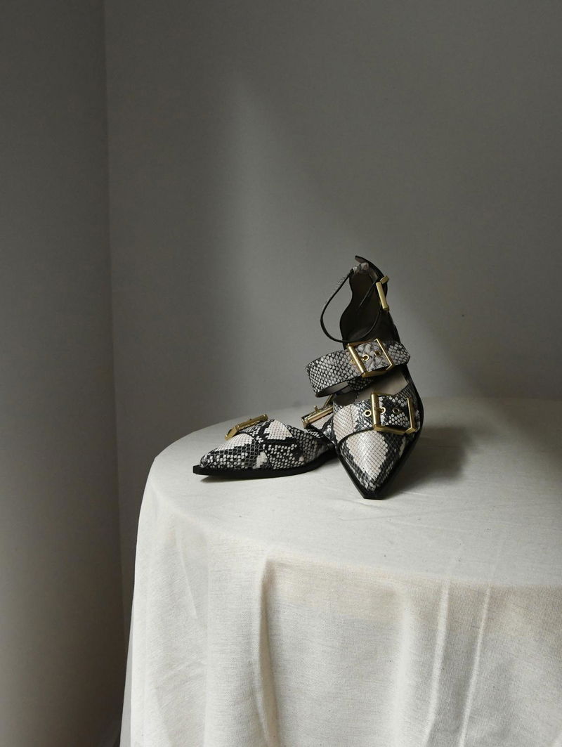 Featuring a visually neutral snakeskin pattern in a mix of light and dark tones, these pointed flats offer a standout style with triple buckle closures. The flat heel and ankle height design provide comfort and versatility, making them a chic choice for casual outings or lively events.