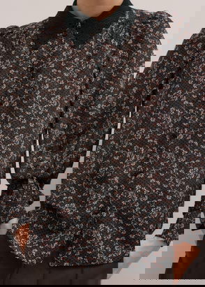 We've got frills. This is the Iryna Top. Crafted from a sheer recycled fabric to an easy v-neck silhouette, printed with new season florals. It's pintucked beneath the bust to create shape but keep to a loose fit, while the back seam features elastic for stretch and comfort. Frills come into play, decorating the neckline with bigger frills on the shoulders and blouson sleeves. It's easy to dress up with tailoring pieces or layer underneath classic slips.