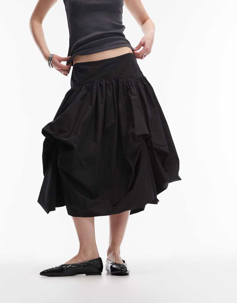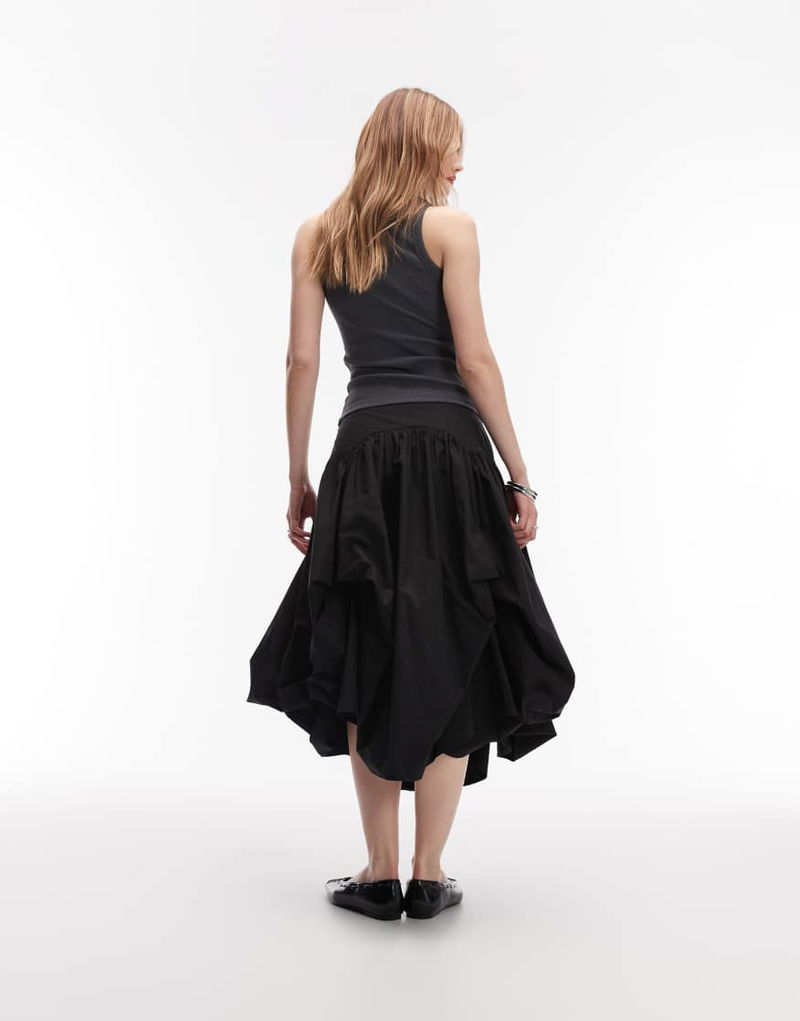 Juniper Drop Waist Aysmetric Volume Midi Skirt In Black