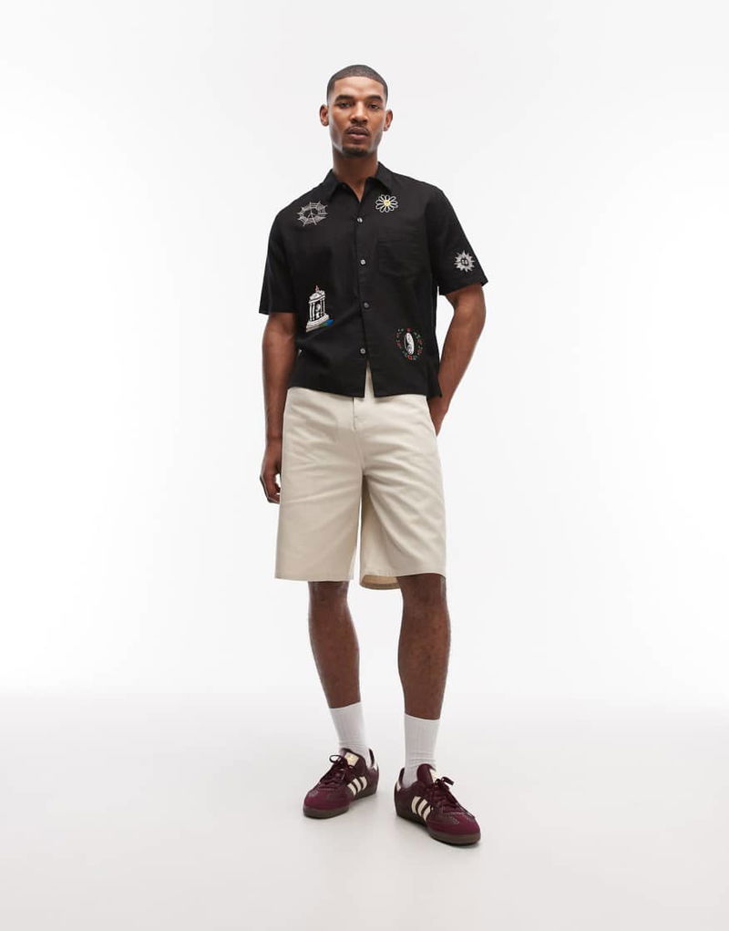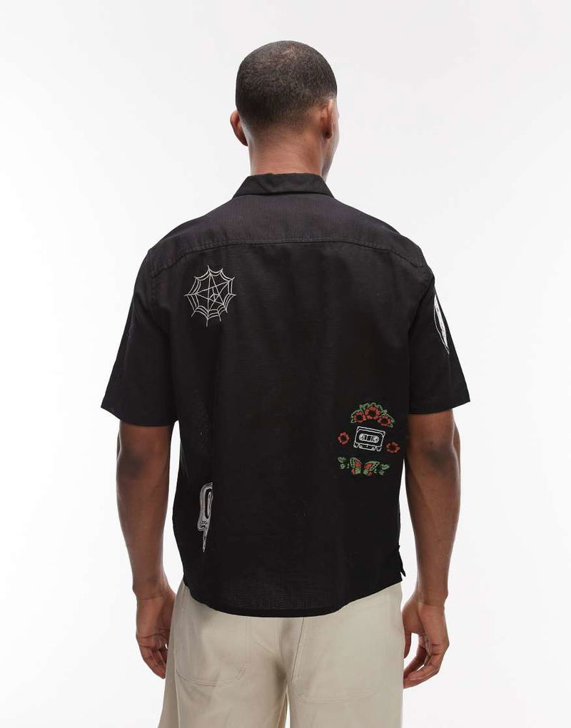 Karlton Short Sleeve Linen Blend Embroidered Shirt In Black