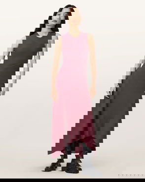 The shape is defined by the long sleeves and v-neckline that is gathered around a tortoise shell ring. To complete the look, a slight flare is added to the hem and cuffs. Looking forward to sunset dinner dates this summer? This is the dress.