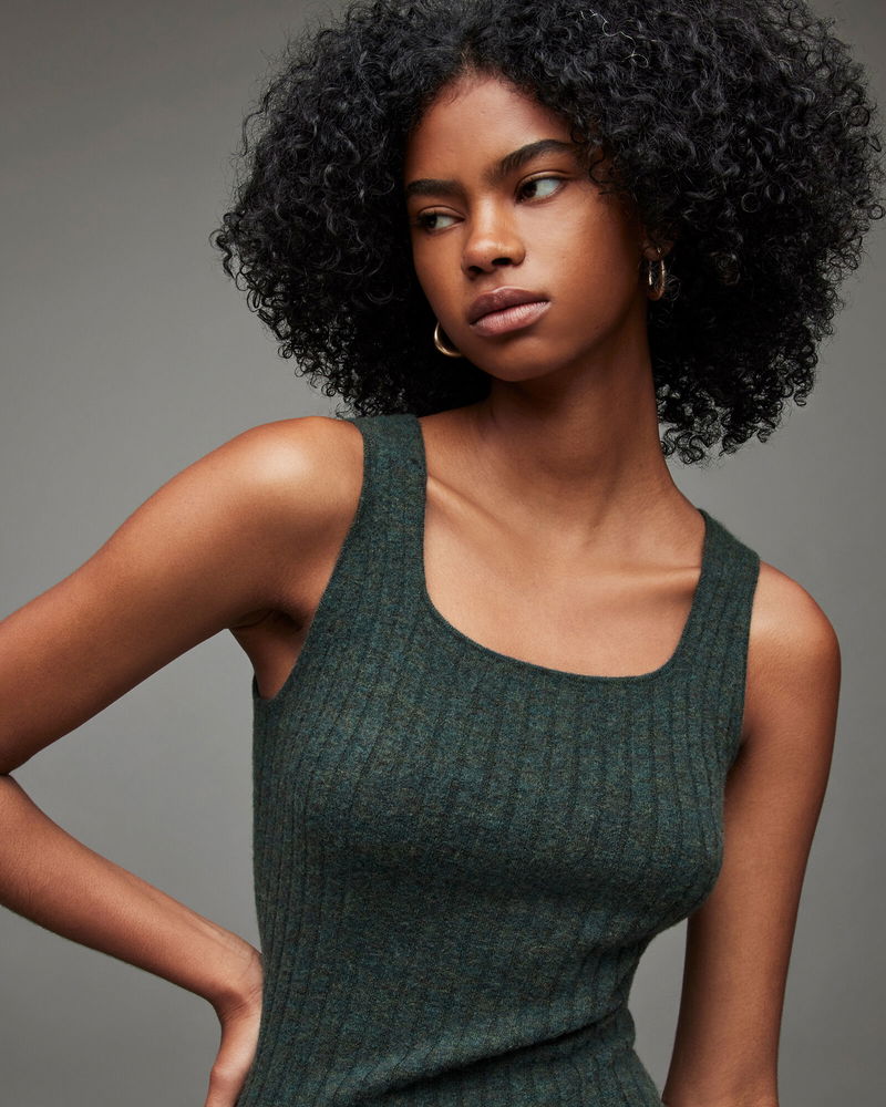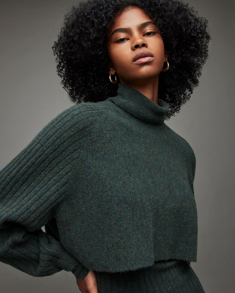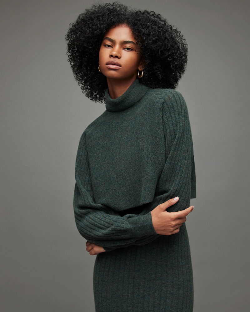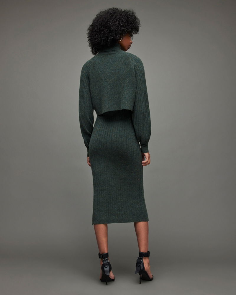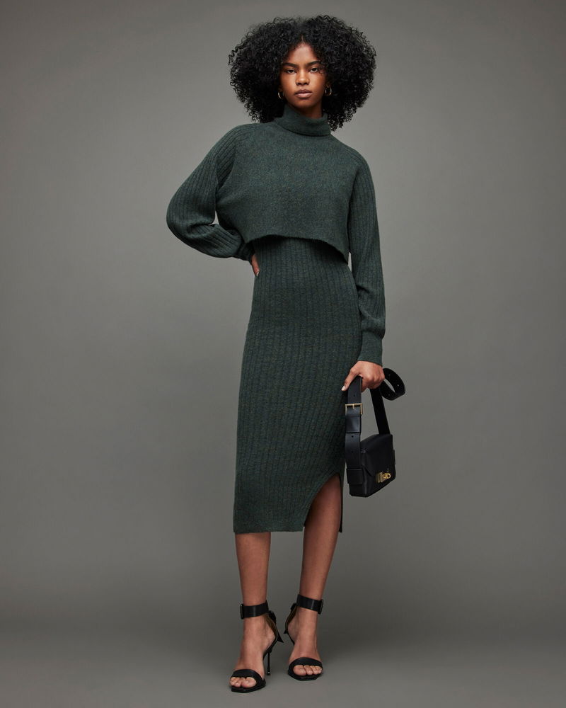 The Margot Dress. It's ribbed throughout and layered, so you don't have to. The jumper features a roll neck with added volume in the sleeves. It sits on a bodycon dress with side splits.