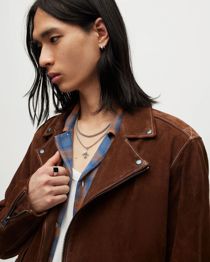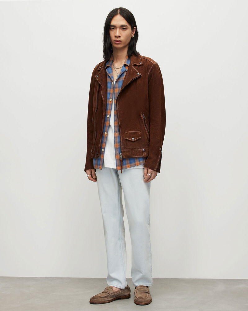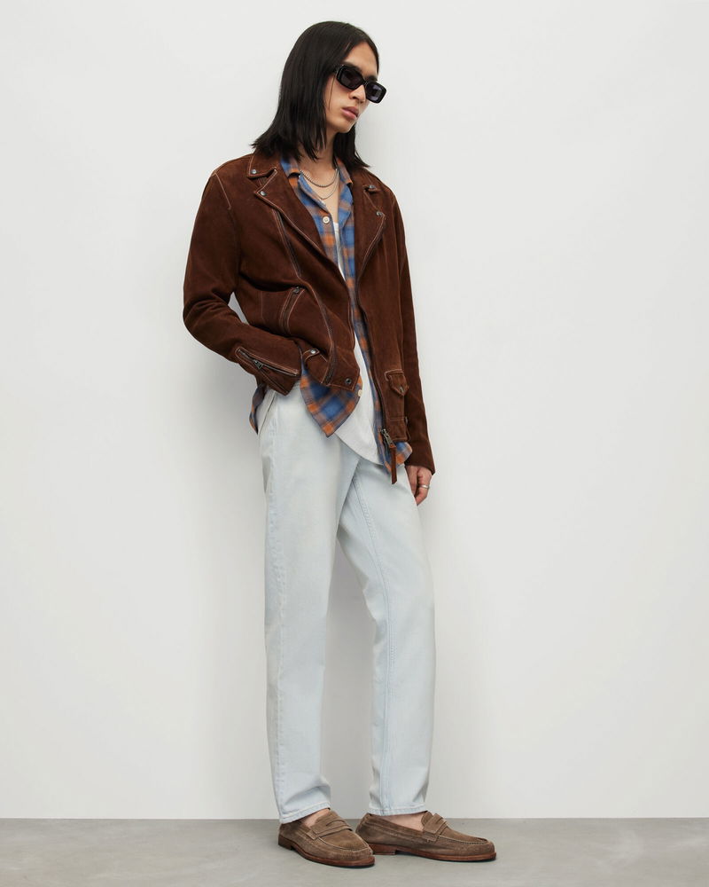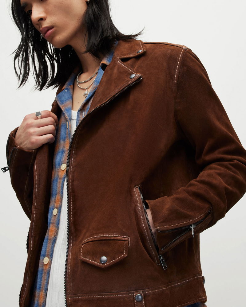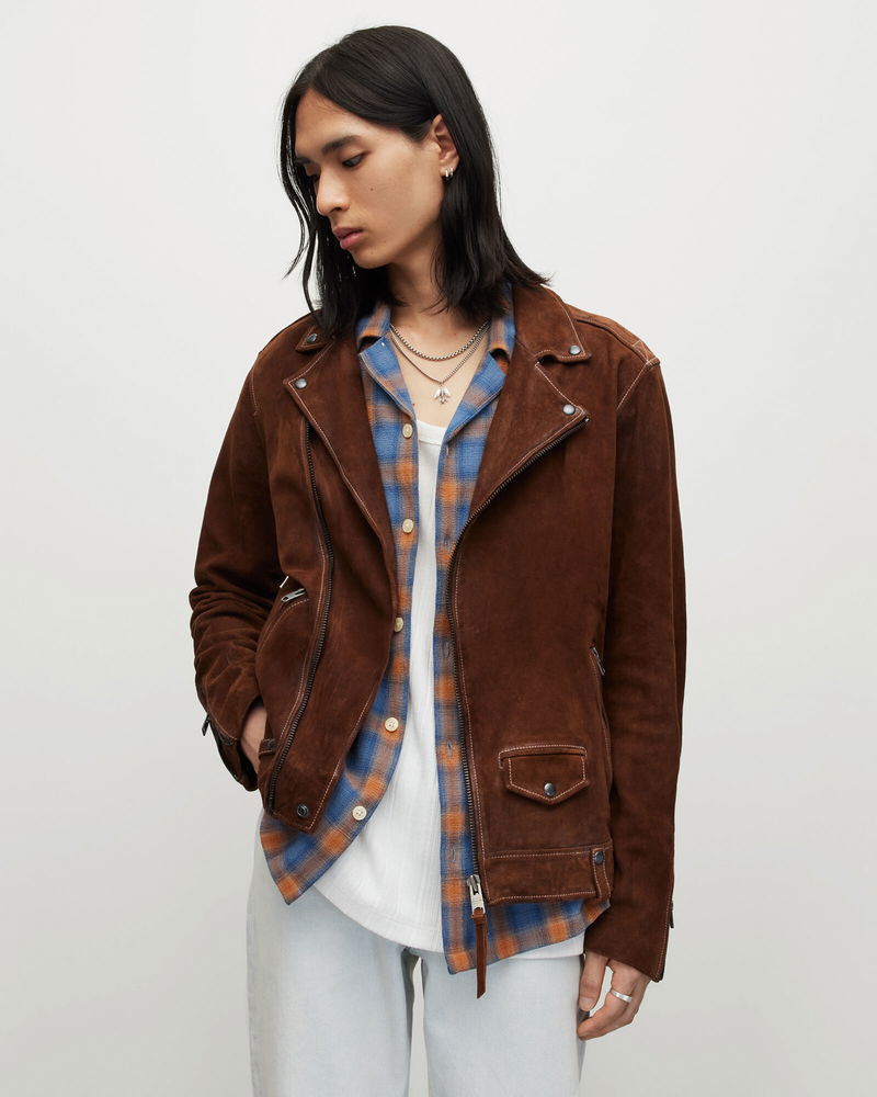 The Milo Biker. Made from soft suede, with biker jacket details. It's got a ticket pocket, hem loops and silver metal zips - just add the motorbike.