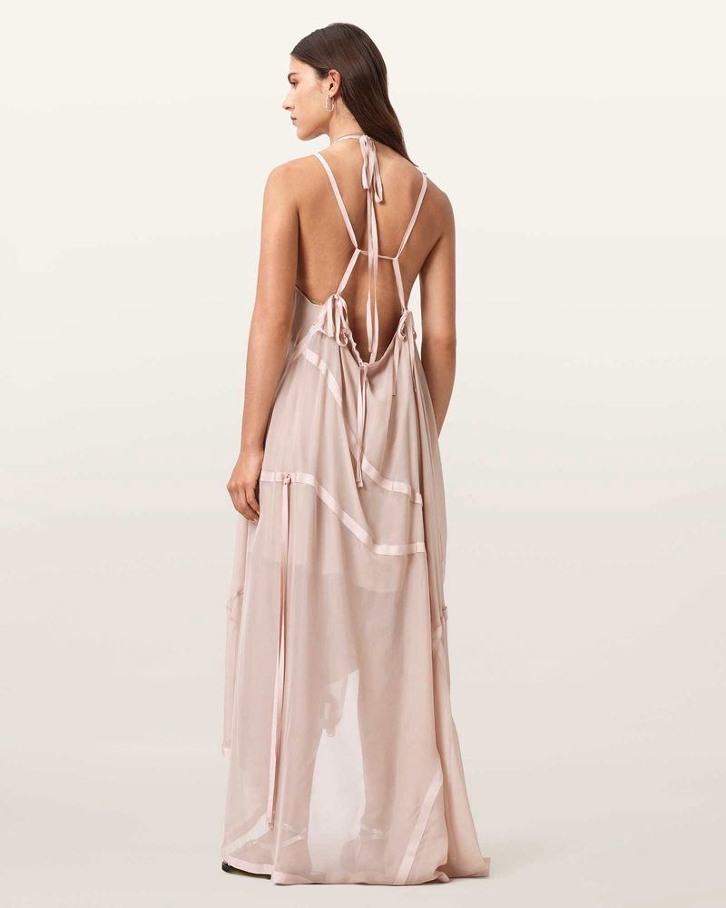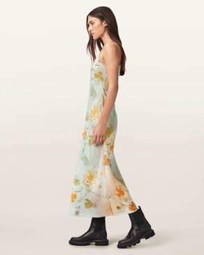 t’s landed… An icon, reimagined – proudly introducing the Parachute Dress, a reinvention of the striking design from our AW08 archives, originally created using a parachute. Handcrafted from pure silk at our in-house atelier in Spitalfields, East London, today’s limited-edition version has been reshaped with contemporary details with wearability in mind. Sleeker clean lines, satin grosgrain trims and a scattering of branded metal D-rings add that infamous AllSaints edge. Embrace your creativity and wear this unique statement piece in your own individual way – gather and tie the fluid fabric to create a new silhouette every time you wear it, whether that’s with skyscraper heels for a special event, bare-footed at a beach wedding, or hitched up over biker boots and layered over one of our long-sleeve mesh tees for a more rock ‘n’ roll take.