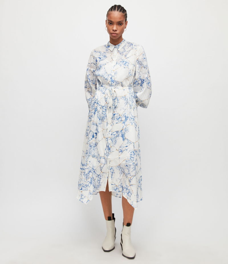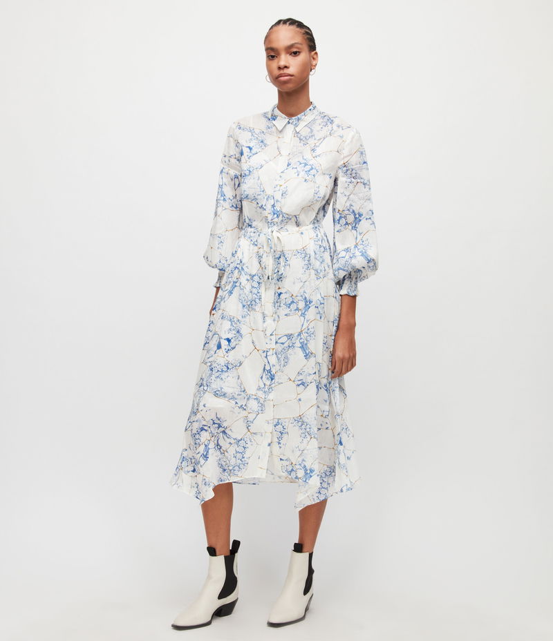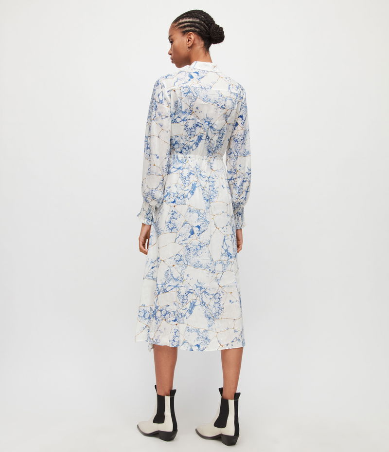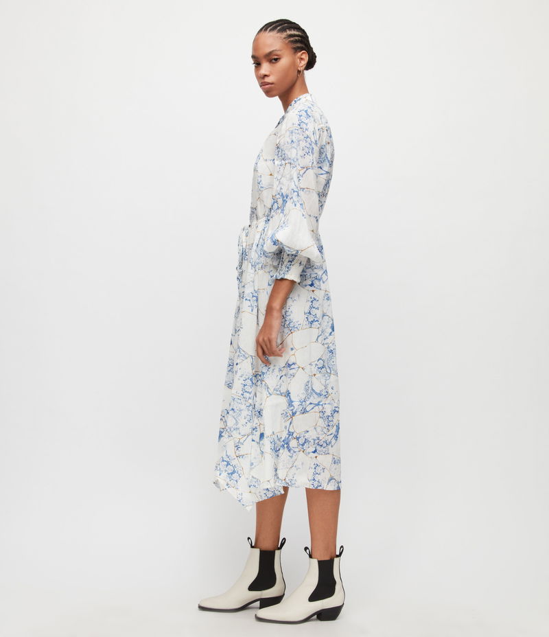 Meet the Skye Dress, crafted from a silk linen blend fabric. The print is called Buruberu - inspired by the Japanese art of Kintsugi where broken porcelain is put back together and fixed with gold. A drawcord waist makes for an easy fit. Finished with smocked blouson sleeves and our signature asymmetric hem.