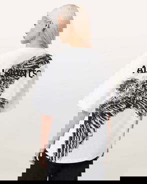 Looking for a versatile styling option? Meet the Amelie T-Shirt. Made from organic cotton, it's shaped to a classic crew-neck silhouette with dropped shoulders, creating a relaxed boxy fit. At the back there's a slight curved hem to add more dimension to the shape. Complete with a metallic foiled artwork, you'll know it – it's so AllSaints.