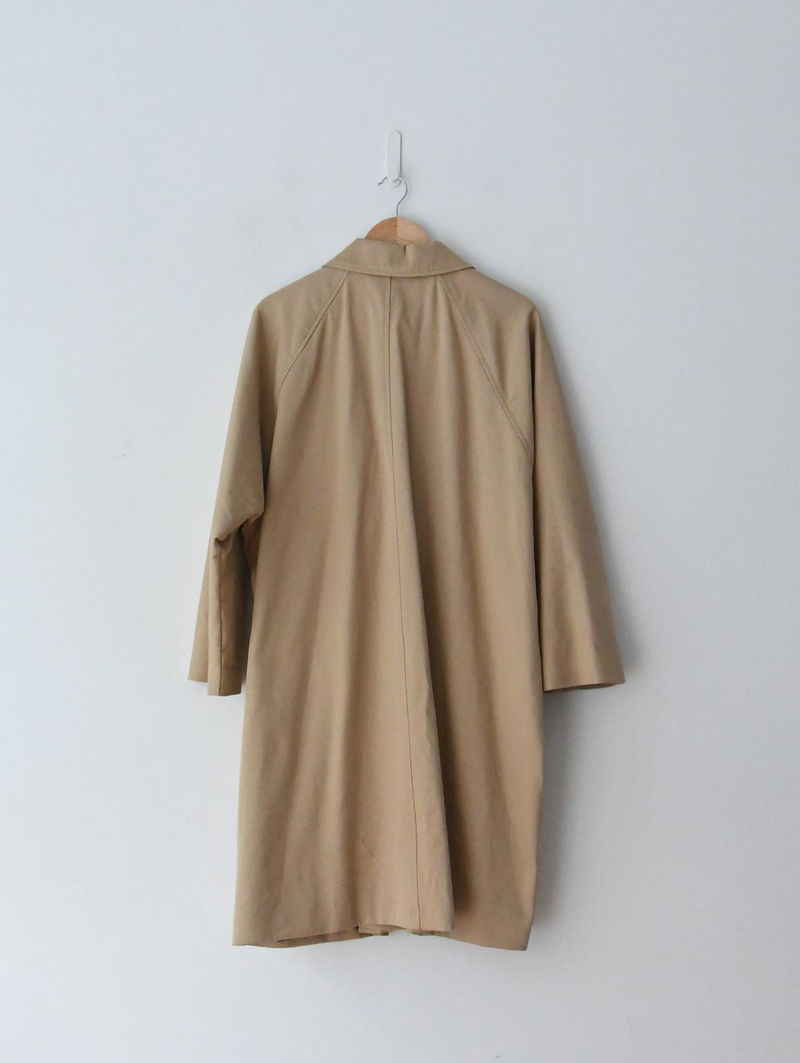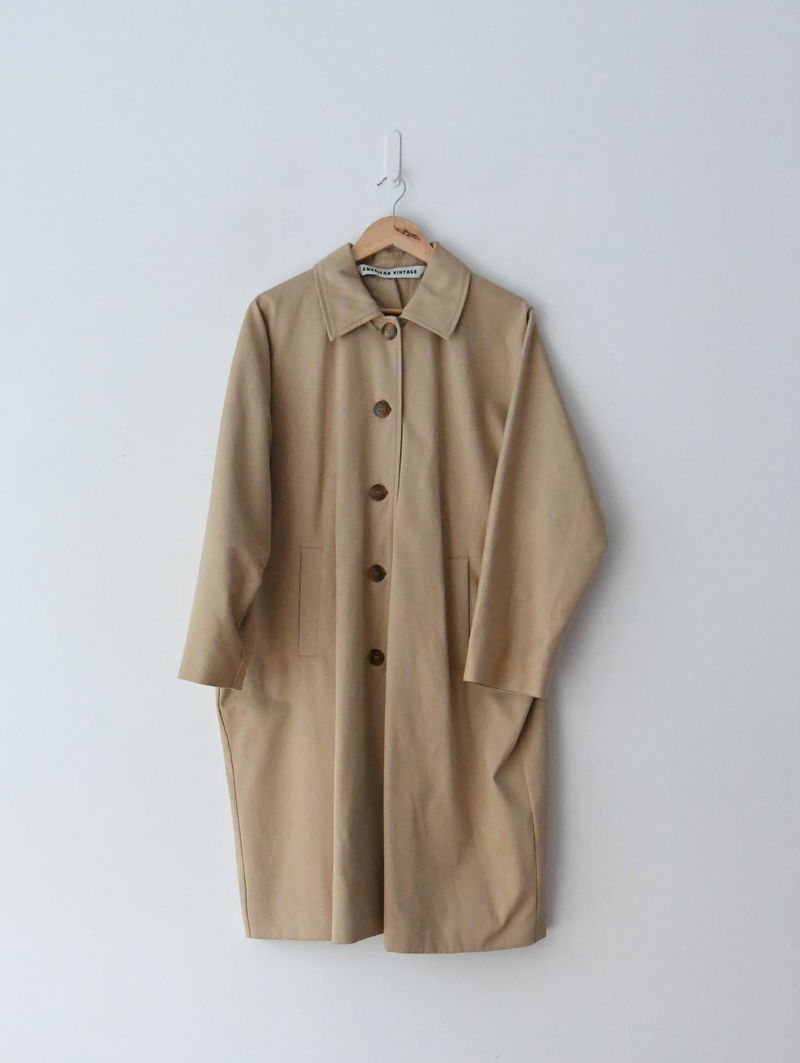 Mid-length large trench coat, there is a tiny hole on the inside pocket and price is reflective of this. Made from 100% cotton (fibres from organic farming).