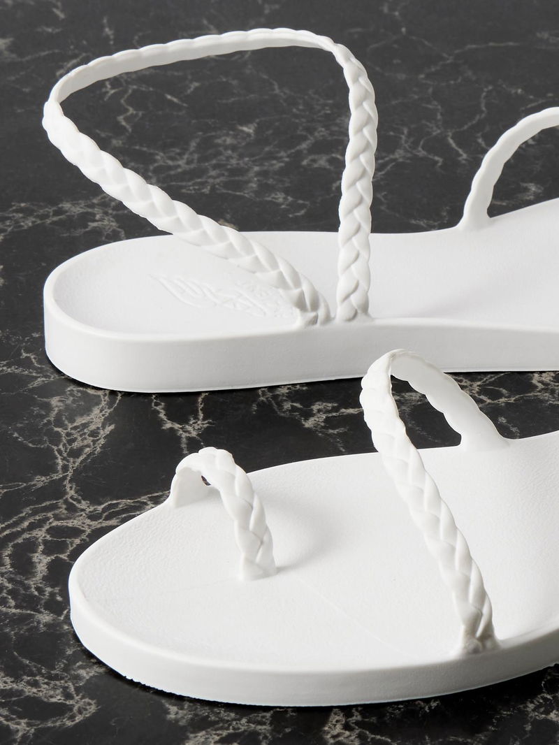 Ancient Greek Sandals' 'Eleftheria' sandals are designed with three straps that wrap elegantly around your foot. They're made from white rubber and set on a 10mm heel for added lift and comfort. Wear them to the beach or dinner post-swim.