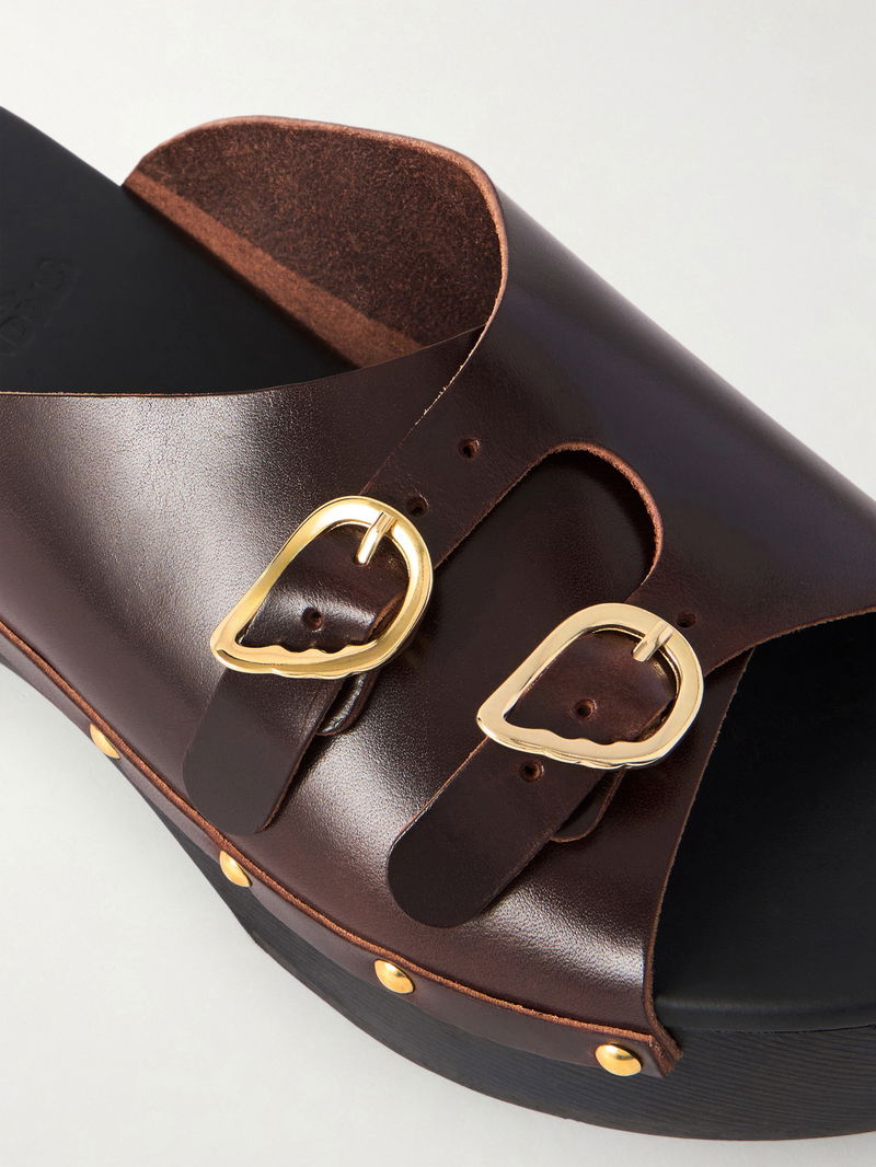 Ancient Greek Sandals' 'Natali Sabot' clogs channel a free-spirited mood, especially when styled with flares. Made with wood platforms, they have leather straps that are finessed with double buckles. Rubber grips and padded insoles ensure they're practical - and comfortable.