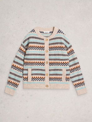 Spun from Sottish Geelong lambswool and linked entirely by hand, &Daughter's cardigan is knitted with a heritage Fair Isle pattern and has a slim shape. It fastens with lustrous mother-of-pearl buttons through the front. Wear yours with straight-leg jeans or tailoring.