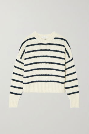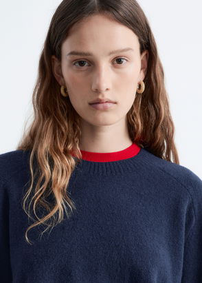 &Daughter’s ‘Caragh’ sweater is made from British Geelong lambswool and knitted for a slightly thicker handle that enhances the fiber’s natural warmth and softness. Hand-finished in Scotland, it has slouchy dropped shoulders and thick ribbed trims.